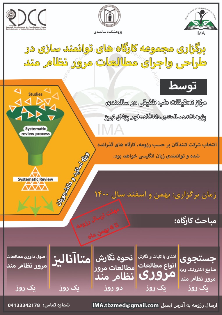 به گزارش روابط عمومی معاونت تحقیقات و فناوری دانشگاه، مرکز تحقیقات طب تلفیقی در سالمندی، در نظر دارد، مجموعه کارگاه های طراحی و اجرای مطالعات مرور نظام مند را با همکاری مرکز توسعه و هماهنگی پژوهش برگزار کند.