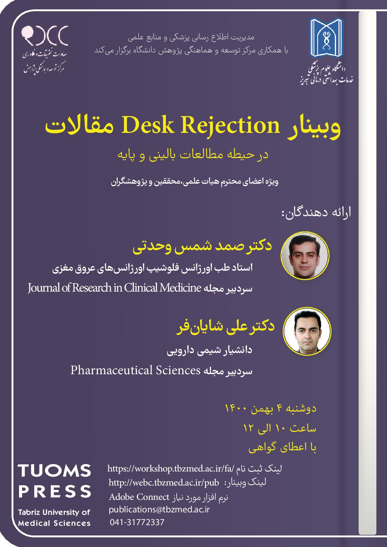 مدیریت اطلاع رسانی پزشکی و منابع علمی، با همکاری مرکز توسعه و هماهنگی پژوهش دانشگاه علوم پزشکی تبریز وبینار Desk Rejection"علل ردّ سریع مقالات پایه و بالینی" را برگزار کرد.