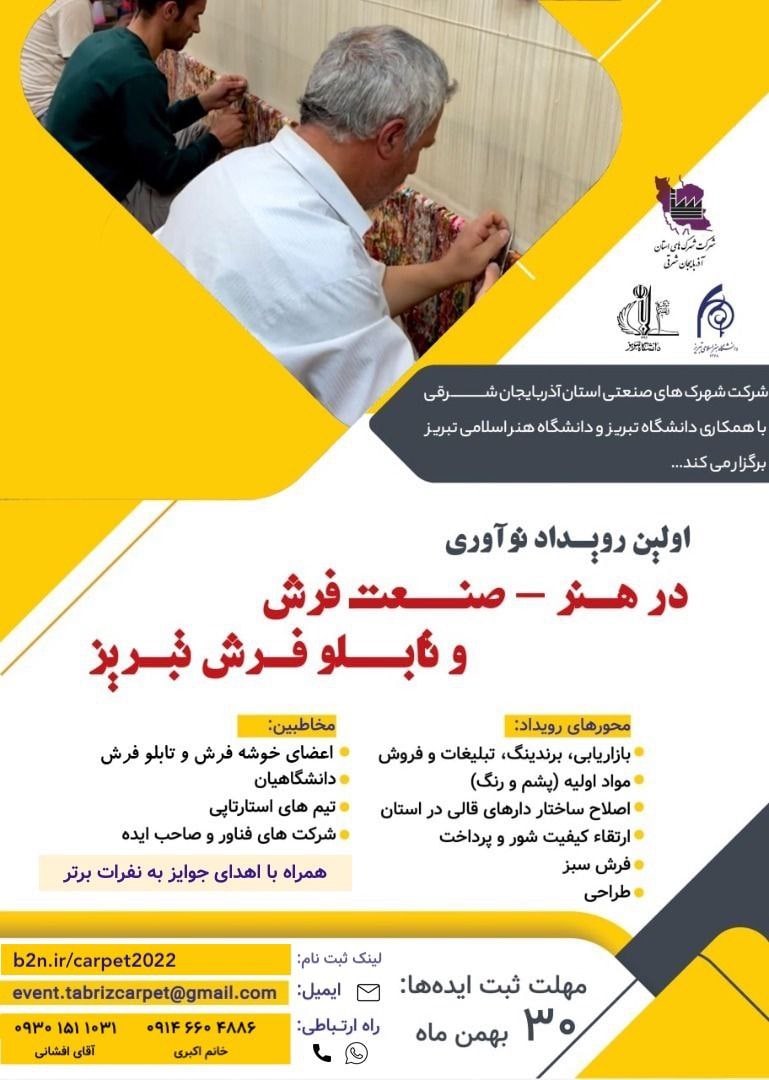 اولین رویداد نوآوری در هنر- صنعت فرش و تابلو فرش تبریزاز سوی شرکت شهرک های صنعتی استان آذربایجان شرقی با همکاری دانشگاه تبریز و دانشگاه هنر اسلامی تبریز برگزار می شود.