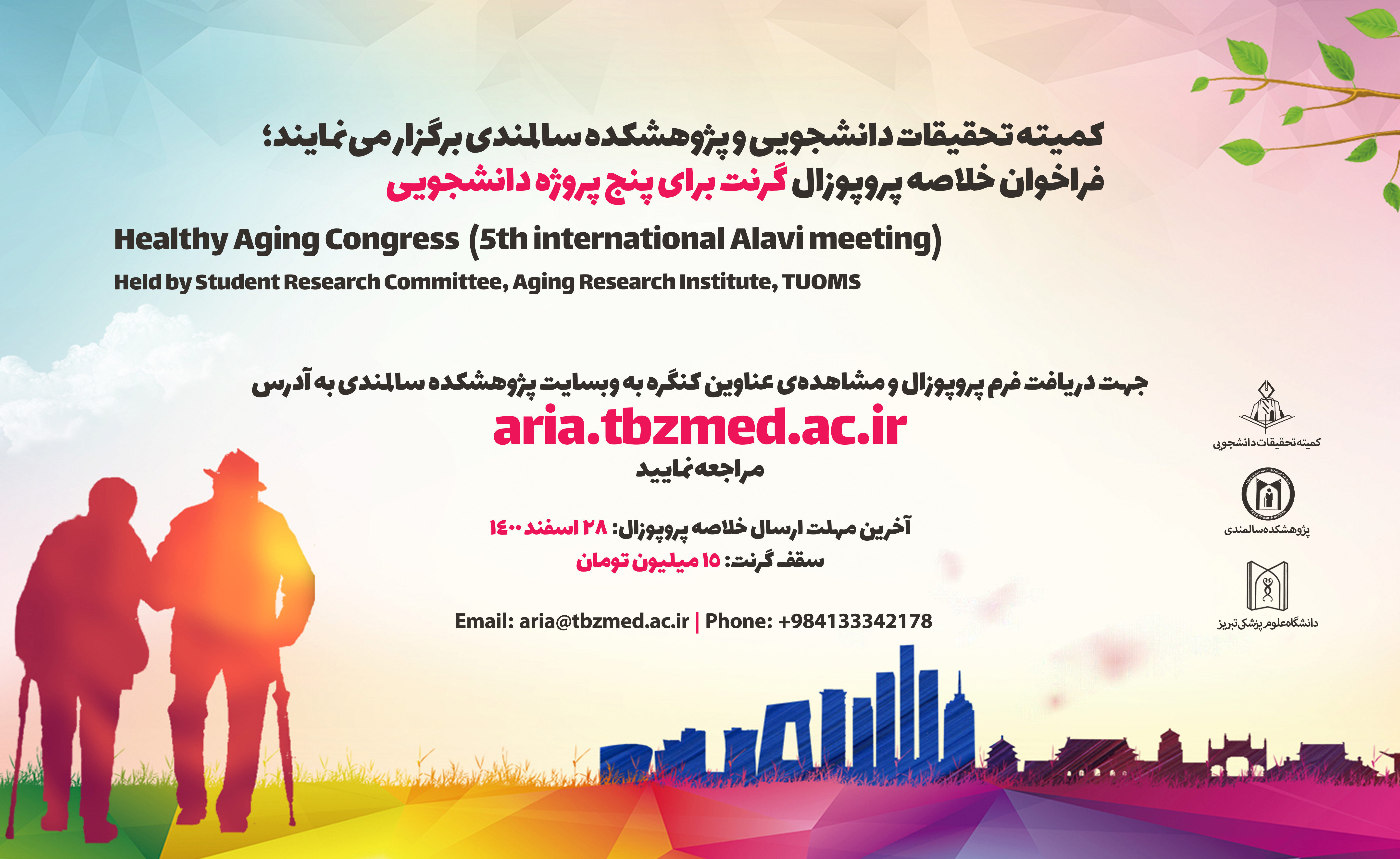 در این فراخوان از محققین و دانشجویان علاقمند دعوت بعمل آمده است تا با حضور فعال در این کنگره، خلاصه طرح های تحقیقاتی خود را به زبان انگلیسی تا تاریخ 28 اسفند 1400 به دبیرخانه پژوهشکده سالمندی واقع در طبقه سوم دانشکده پزشکی دانشگاه علوم پزشکی تبریز ارسال کنند.