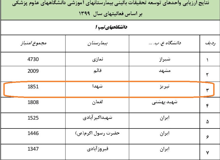 به گزارش روابط عمومی معاونت تحقیقات و فناوری دانشگاه علوم پزشکی و خدمات بهداشتی درمانی تبریز، دکتر پرویز شهابی از کسب رتبه سوم کشوری واحد توسعه تحقیقات بالینی مرکز آموزشی درمانی شهدا، در میان واحدهای توسعه تحقیقات بالینی بیمارستان های آموزشی دانشگاه های علوم پزشکی تیپ یک کشور، بر اساس آخرین ارزیابی صورت پذیرفته فعالیتهای سال 1399 خبر داد.
