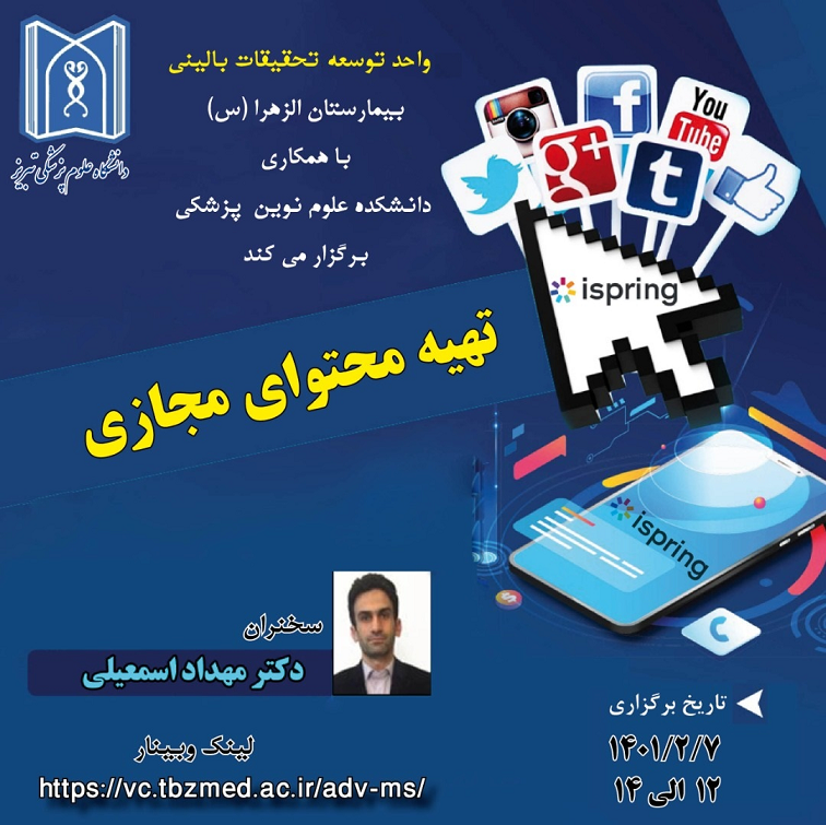 به گزارش روابط عمومی معاونت تحقیقات و فناوری به نقل از واحد توسعه تحقیقات بالینی الزهرا (س)، این واحد با همکاری دانشکده علوم نوین پزشکی وبینار آموزشی پژوهشی " تهیه محتوای مجازی " را روز چهارشنبه هفتم اردیبهشت 1401 از ساعت 12 الی 14 با سخنرانی دکتر مهداد اسماعیلی برای گروه هدف اعضای هیت علمی، دانشجویان ،کارکنان و فراگیران برگزار می نماید.