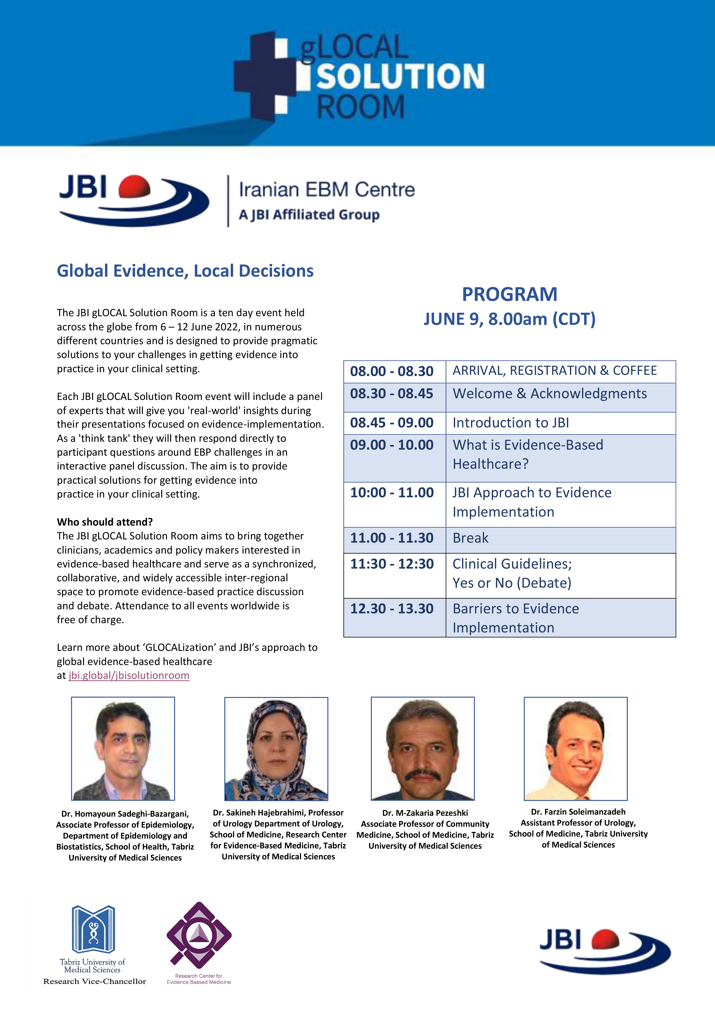 در این نشست که با محوریت چالش ها و راهکارهای عملکرد مبتنی بر شواهد برگزار خواهد گردید، در خصوص مراقبت سلامت مبتنی بر شواهد و رویکرد JBI به آن، راهنماهای بالینی، و موانع پیاده سازی شواهد در عملکرد سخنرانی، بحث و تبادل نظر خواهد گردید.