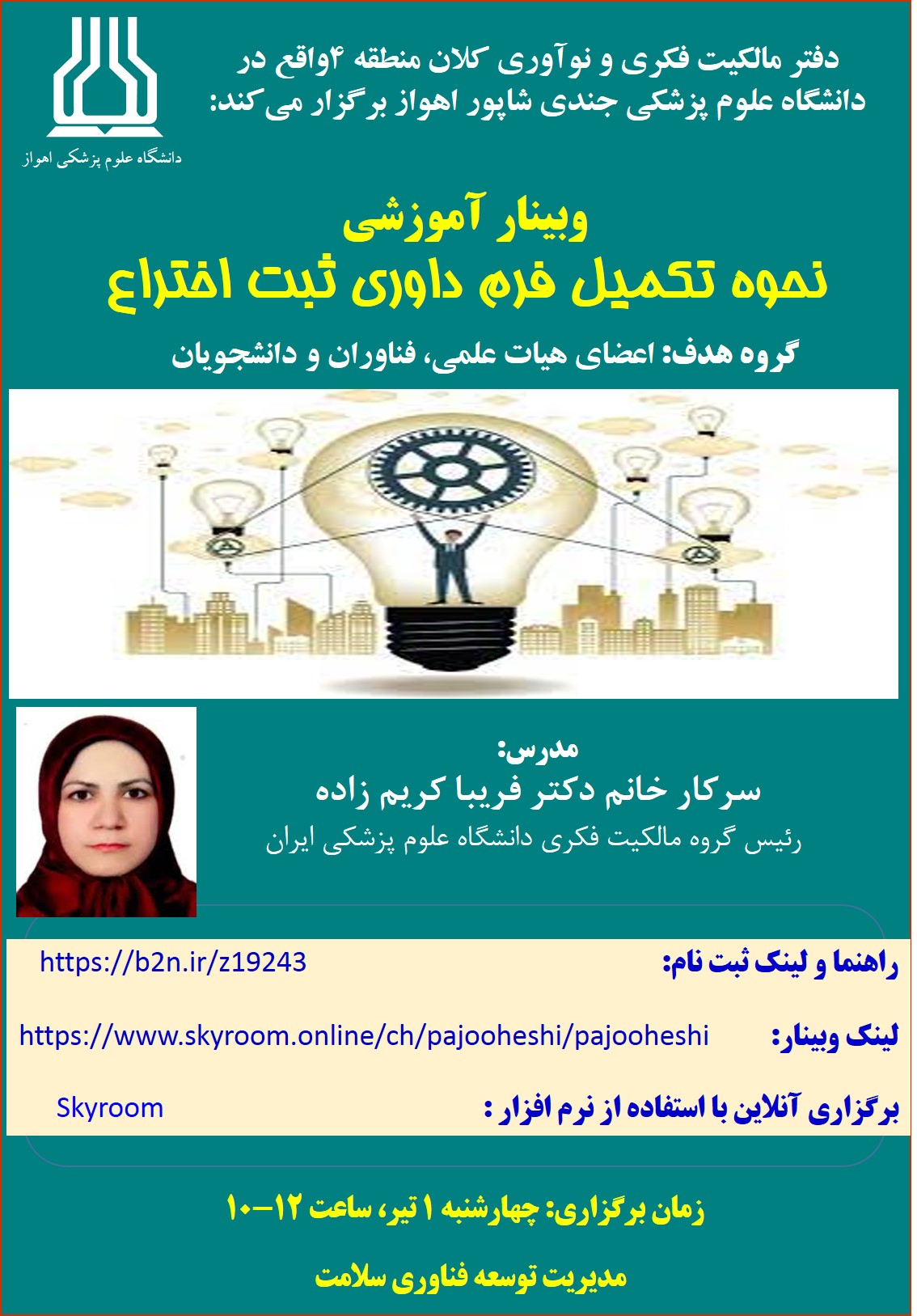 دفتر مالکیت فکری و نوآوری کلان منطقه 4 واقع در دانشگاه علوم پزشکی جندی شاپور اهواز برگزار " وبینار آموزشی نحوه تکمیل فرم داوری ثبت اختراع " را برگزار می نماید.