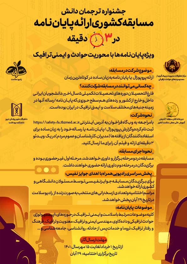 به گزارش روابط عمومی معاونت تحقیقات و فناوری به نقل از مرکز تحقیقات مدیریت و پیشگیری از مصدومیتهای حوادث ترافیکی ، دانشگاه علوم پزشکی تبریز با محوریت این مرکز در نظر دارد به منظور ارتقای مهارت دانشجویان در خلاصه سازی و انتقال یک مطلب علمی در کوتاهترین زمان و با زبان ساده و قابل درک، مسابقهای تحت عنوان "ارائه پایان نامه در 3 دقیقه" را برای دانشجویان تحصیلات تکمیلی دانشگاههای کلان منطقه دو آمایش سرزمینی که پایان نامه آنان در حوزه حوادث ترافیکی است، برگزار نماید.