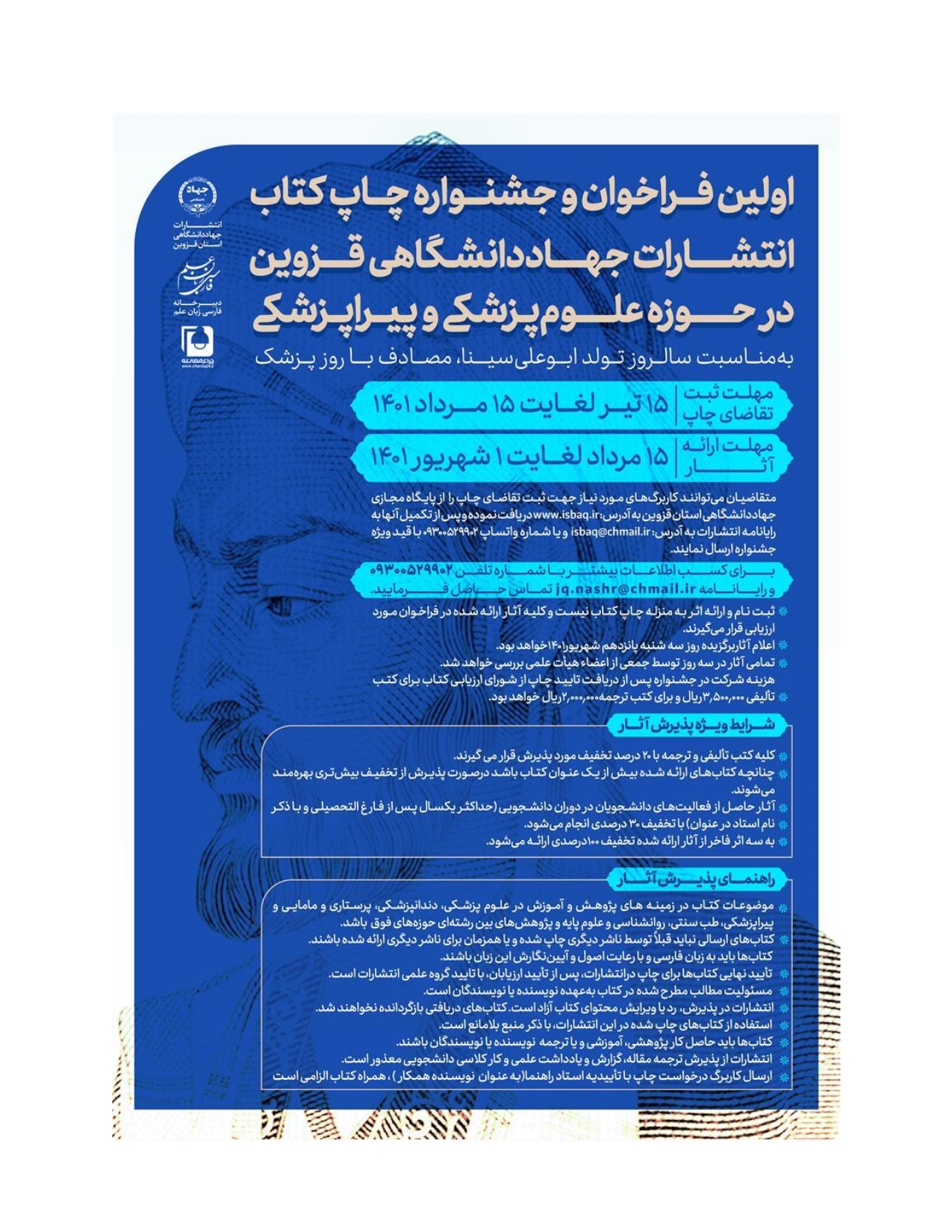 به گزارش روابط عمومی معاونت تحقیقات و فناوری به نقل از جهاد دانشگاهی واحد استان قزوین، به مناسبت سالروز تولد ابوعلی سینا، مصادف با روز پزشک، انتشارات جهاد دانشگاهی قزوین در نظر دارد جشنواره پزشکی و پیراپزشکی را برگزار نماید.