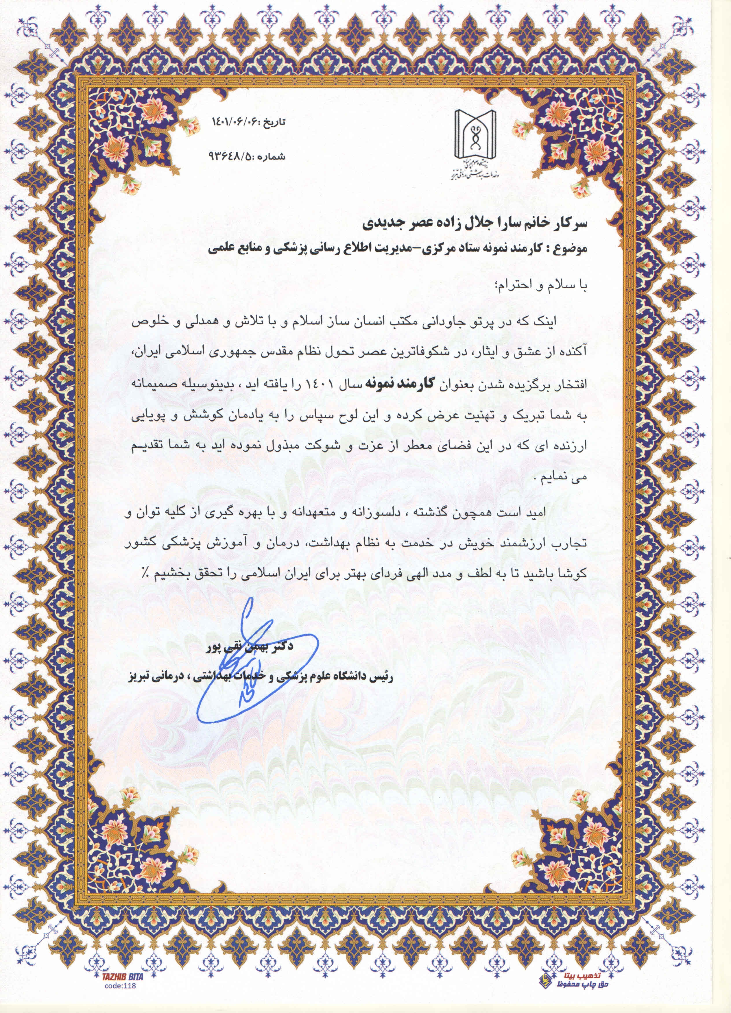 خانم سارا جلال زاده عصر جدیدی کارشناس نشر (مجلات علمی) واحد کتب و انتشارات بعنوان کارمند نمونه سال 1401 برگزیده شدند.