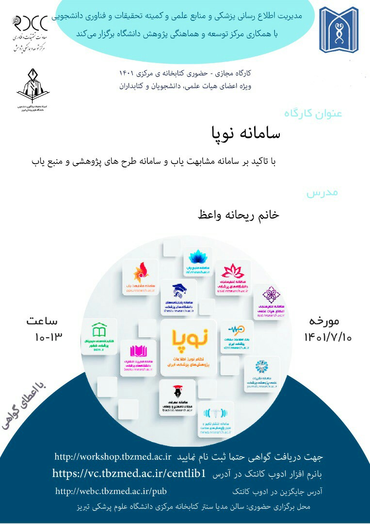 کارگاه آموزشی " سامانه نوپا " توسط مدیریت اطلاع رسانی پزشکی و منابع علمی ( کتابخانه مرکزی ) دانشگاه علوم پزشکی تبریز با همکاری مرکز توسعه و هماهنگی پژوهش دانشگاه به صورت حضوری و مجازی با اعطای گواهی برگزار می گردد.