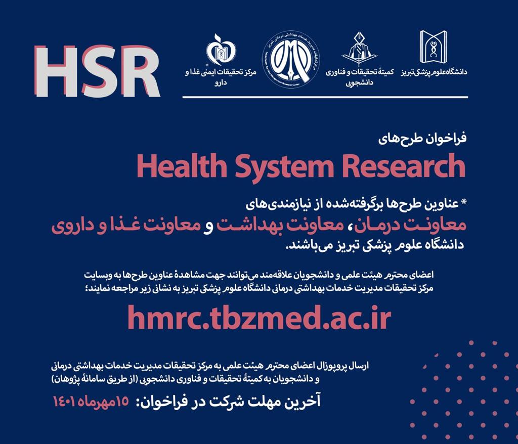 عناوین طرح های Health System Research برگرفته شده از نیازمندی های معاونت درمان ،معاونت بهداشت و معاونت غذا و داروی دانشگاه علوم پزشکی تبریز میباشد.