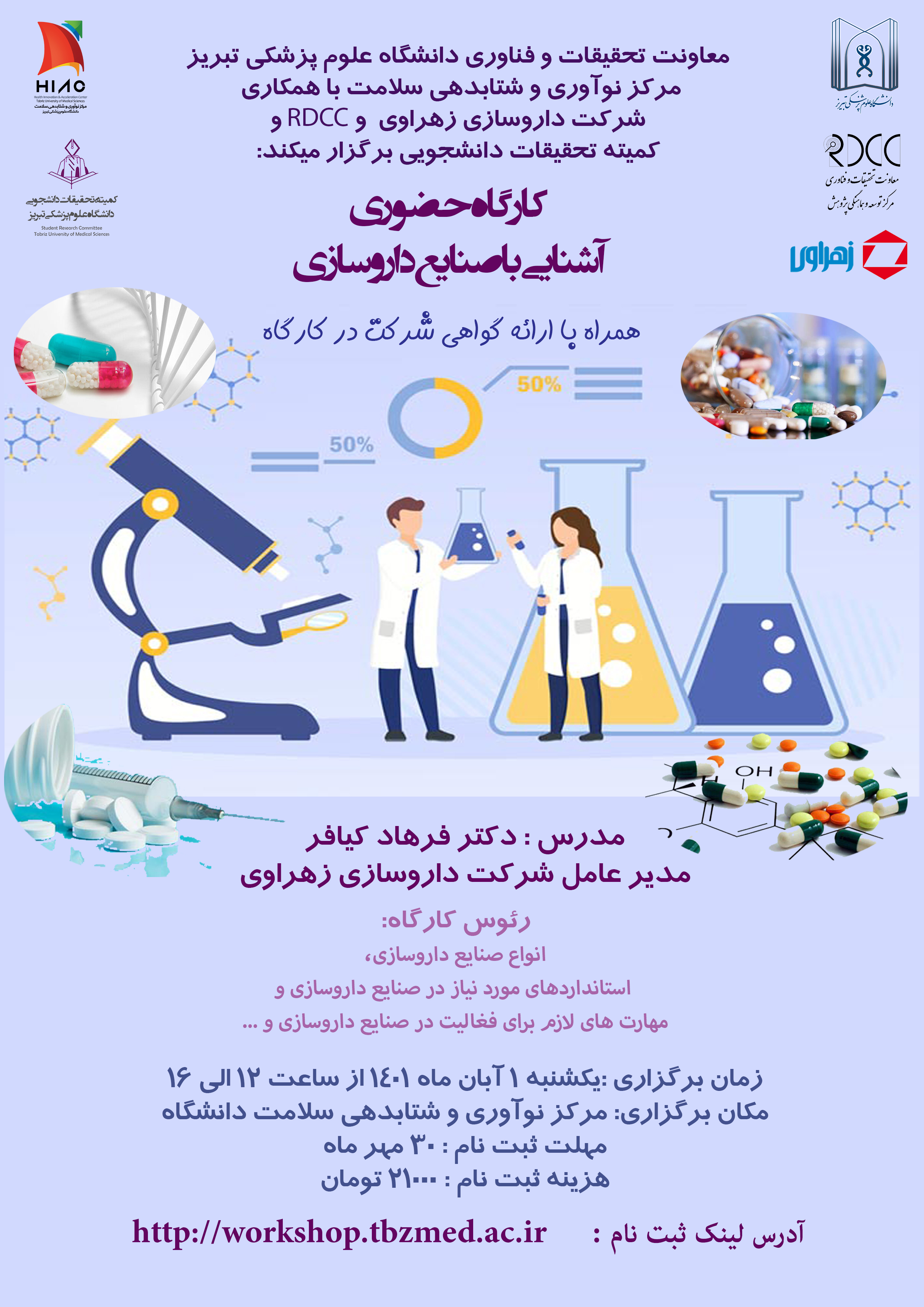 کارگاه حضوری " آشنایی با صنایع داروسازی " ویژه دانشجویان ، محققین و اعضای محترم هیات علمی دانشگاه همراه با ارائه گواهی