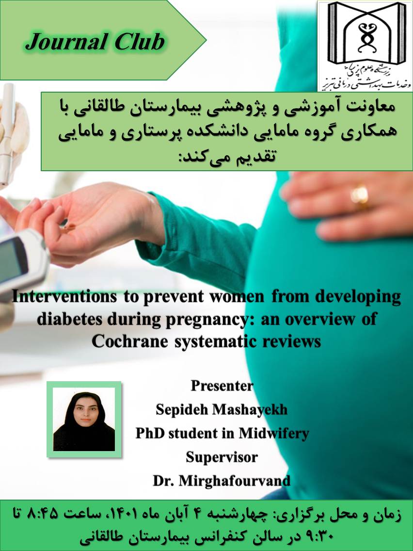 ژورنال کلاب پژوهشی تحت عنوان " مداخلات پیشگیری کننده از دیابت در طول بارداری: مرور مرورهای سیستماتیک کوکران"