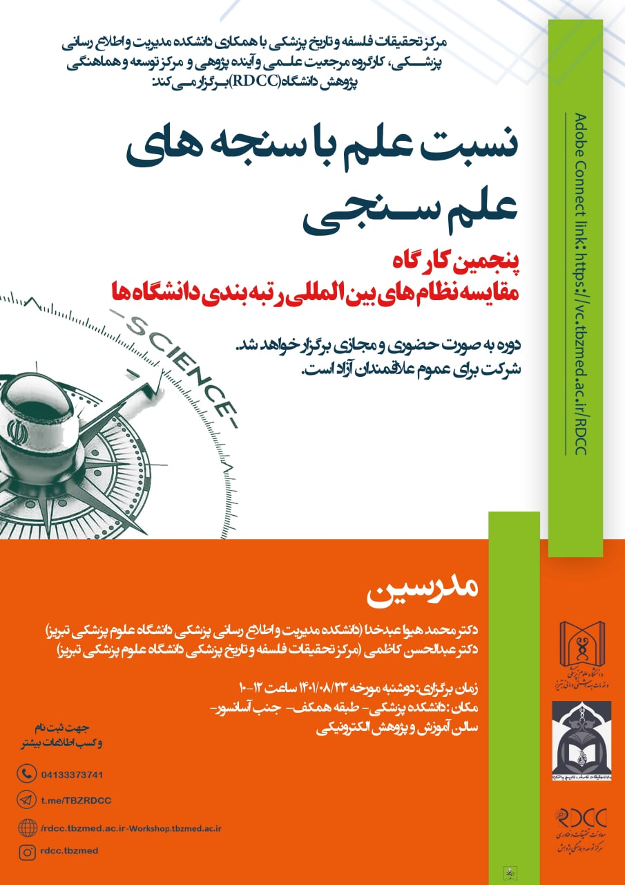 به گزارش روابط عمومی معاونت تحقیقات و فناوری به نقل از مرکز تحقیقات فلسفه و تاریخ پزشکی دانشگاه علوم پزشکی تبریز، این مرکز با همکاری سایر مراکز این دانشگاه، سری کارگاه های آموزشی و توانمند سازی با عنوان" نسبت علم با سنجه های علم سنجی" به صورت ماهیانه برگزار می نماید .