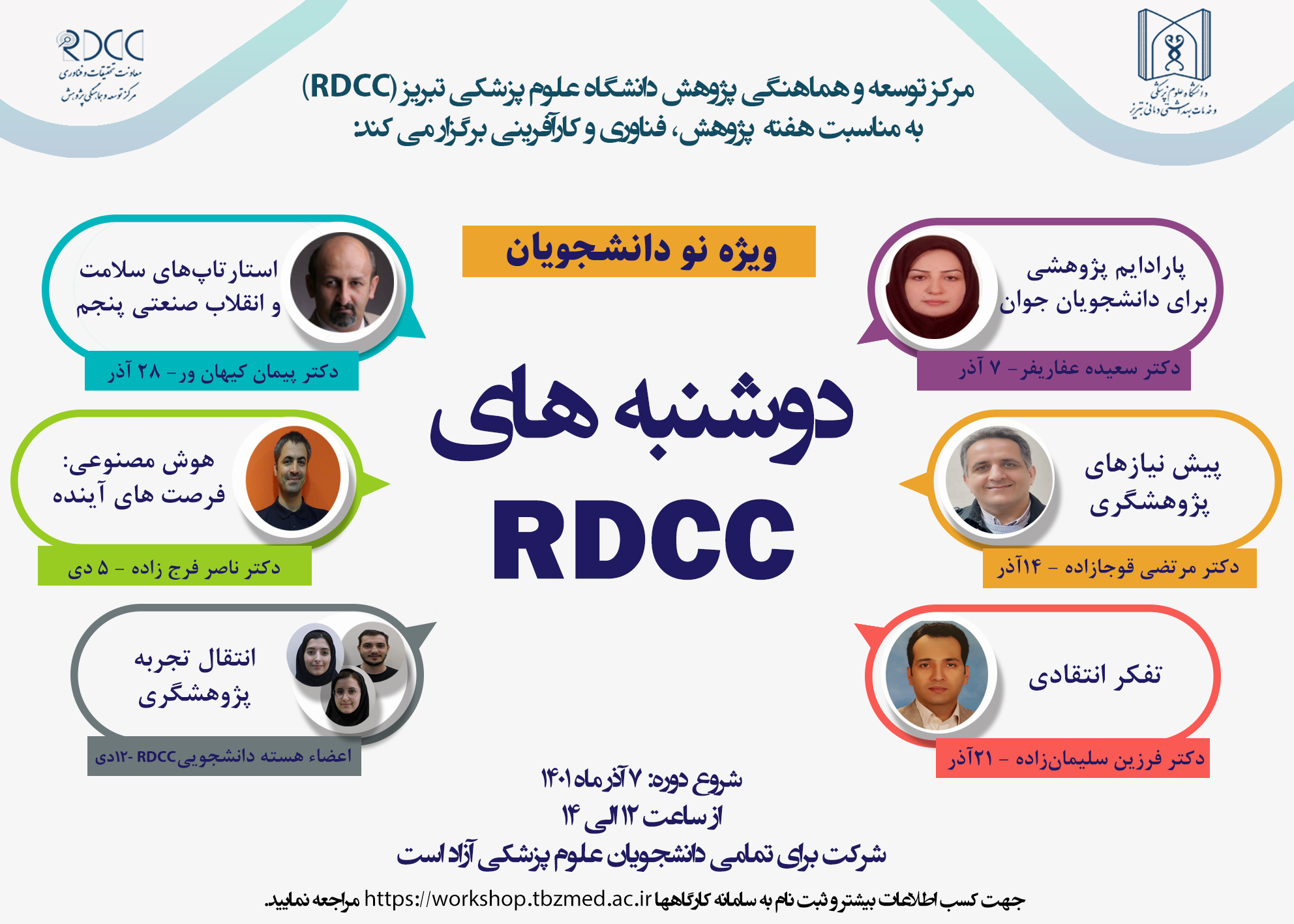 دوشنبه های RDCC برای نودانشجویان کلیه رشتههای تحصیلی علاقمند به فعالیتهای پژوهشی