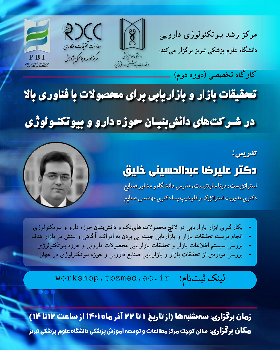 به گزارش روابط عمومی معاونت تحقیقات و فناوری به نقل از مرکز رشد بیوتکنولوژی دارویی ، این مرکز با همکاری مرکز توسعه و هماهنگی پژوهش RDCC دوره دوم کارگاه تخصصی " تحقیقات بازار و بازاریابی برای محصولات با فناوری بالا در شرکت های دانش بنیان حوزه دارو و بیوتکنولوژی" را بصورت دوره ی حضوری سه شنبه ها از 1 آذر لغایت 22 آذر ساعت 14-12 برگزارمی کند.