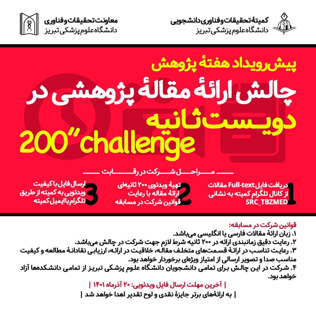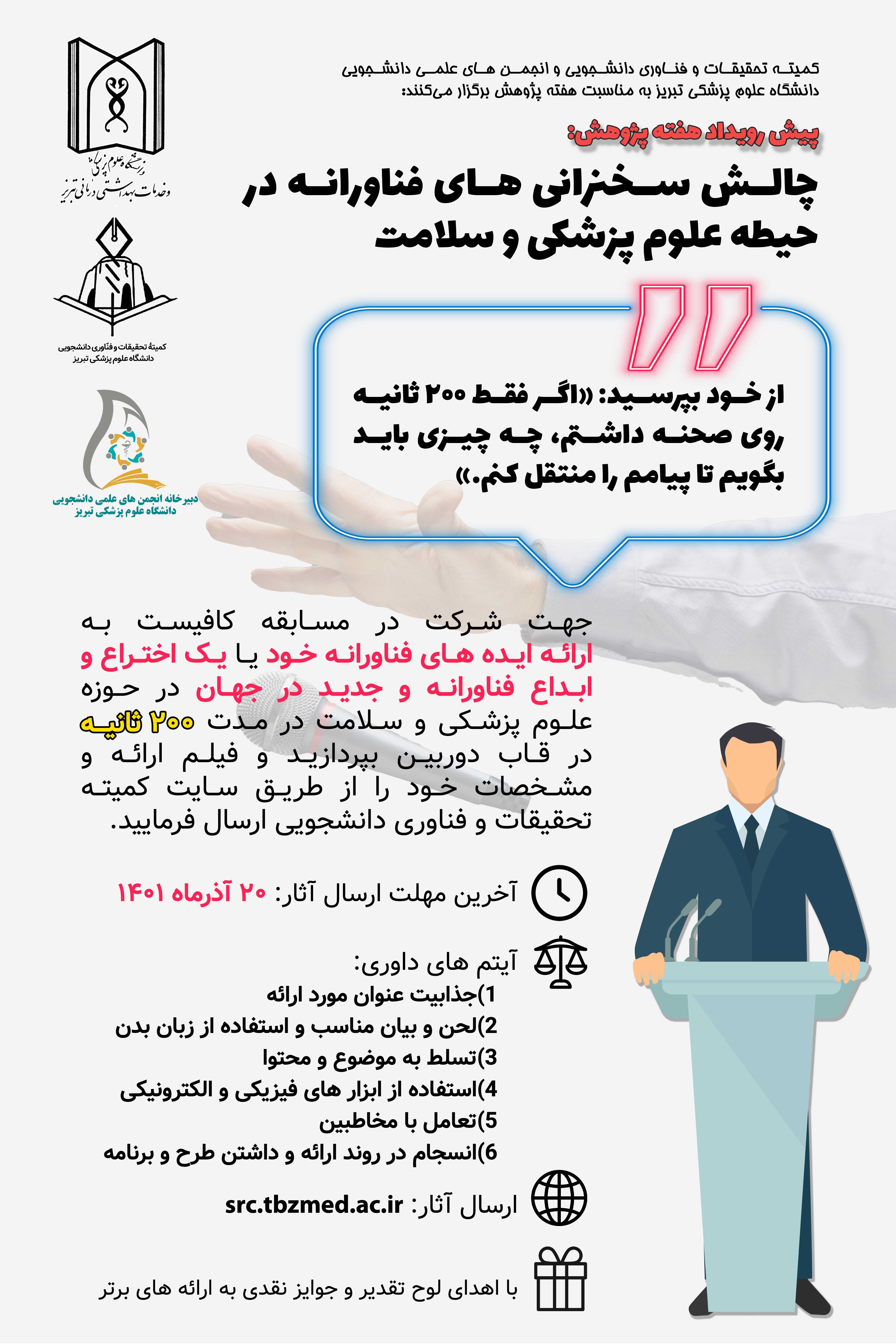 پیش رویدادهای هفته پژوهش ( چالش ارائه مقاله پژوهشی در 200 ثانیه ) ( چالش سخنرانی های فناورانه در حیطه علوم پزشکی )