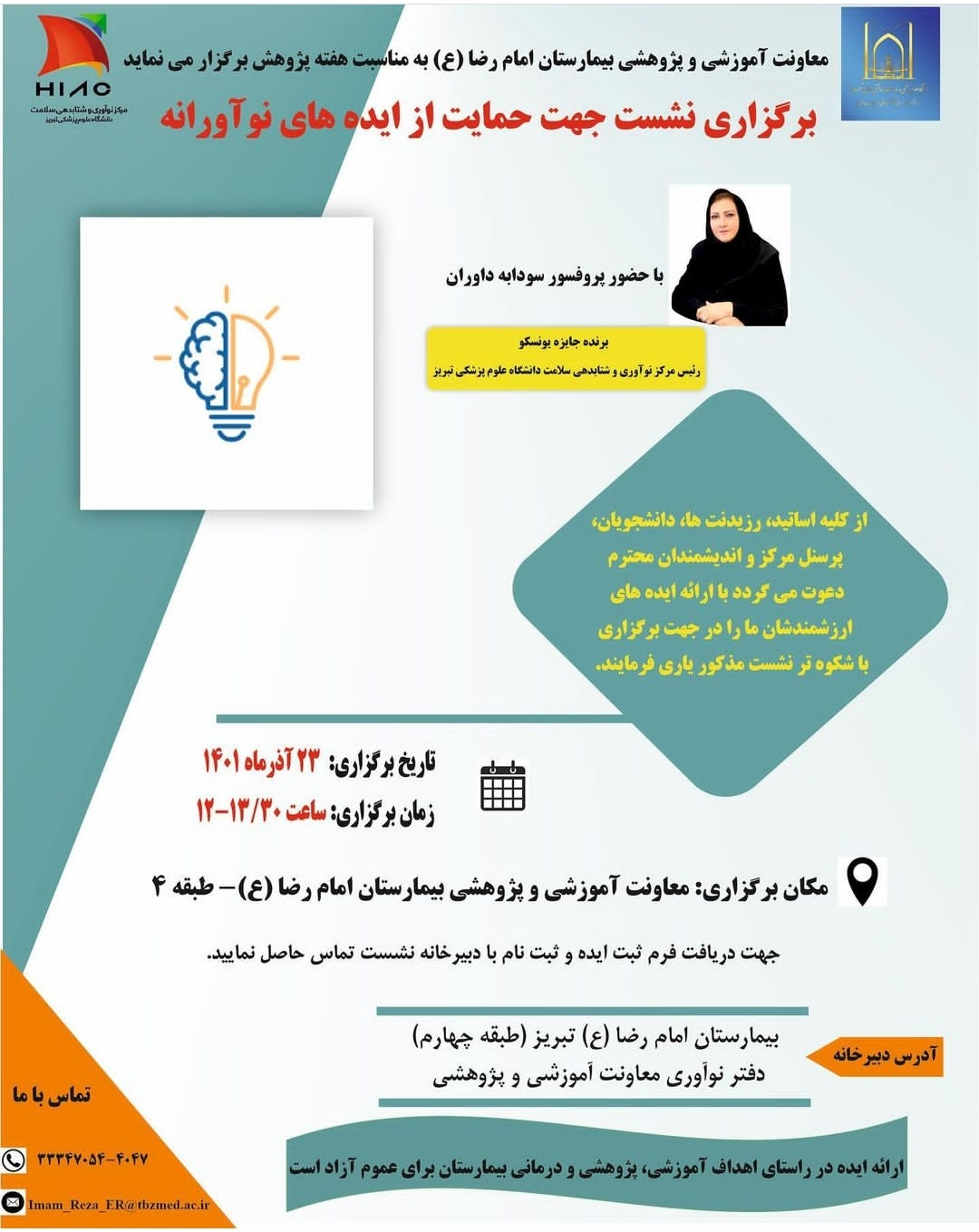 معاونت آموزشی و پژوهشی بیمارستان امام رضا (ع) به مناسبت هفته پژوهش ، نشستی جهت حمایت از ایده های نوآورانه با حضور دکتر سودابه داوران در طبقه 4 بیمارستان در دفتر نوآوری معاونت آموزشی و پژوهشی برگزار می کند.