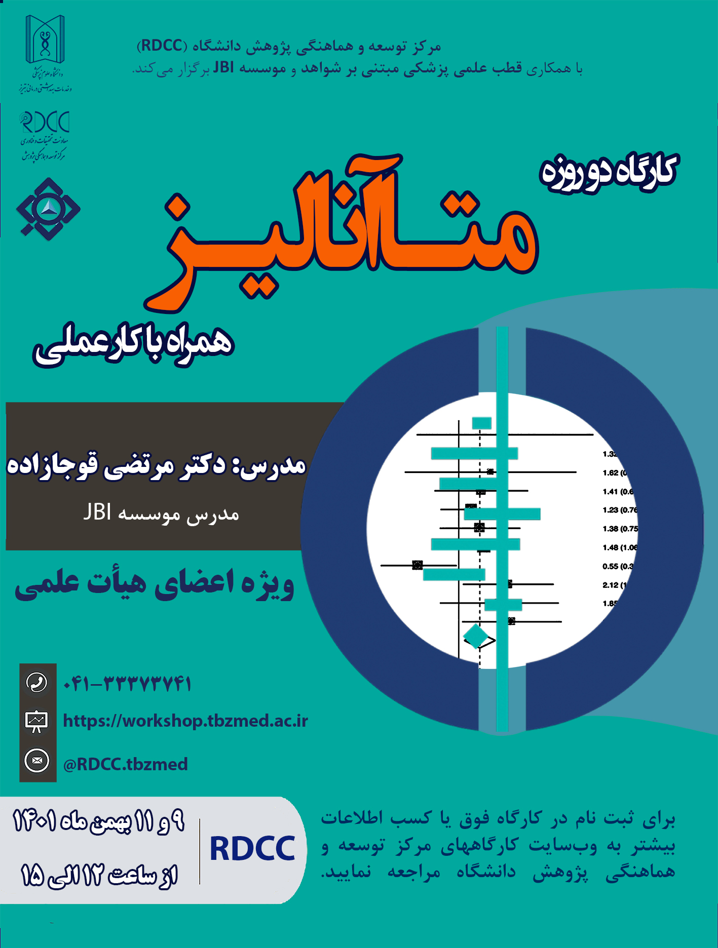 به گزارش روابط عمومی معاونت تحقیقات و فناوری به نقل از مرکز توسعه و هماهنگی پژوهش دانشگاه علوم پزشکی تبریز، این مرکز با همکاری قطب علمی پزشکی مبتنی بر شواهد وموسسهJBI، " کارگاه دوروزه متاآنالیز همراه با کار عملی "را با تدریس دکتر مرتضی قوجازاده، مدرس موسسهJBI طی روزهای یکشنبه و سه شنبه نهم ویازدهم بهمن ماه 1401 از ساعت 12 الی 15 برگزار می نماید.