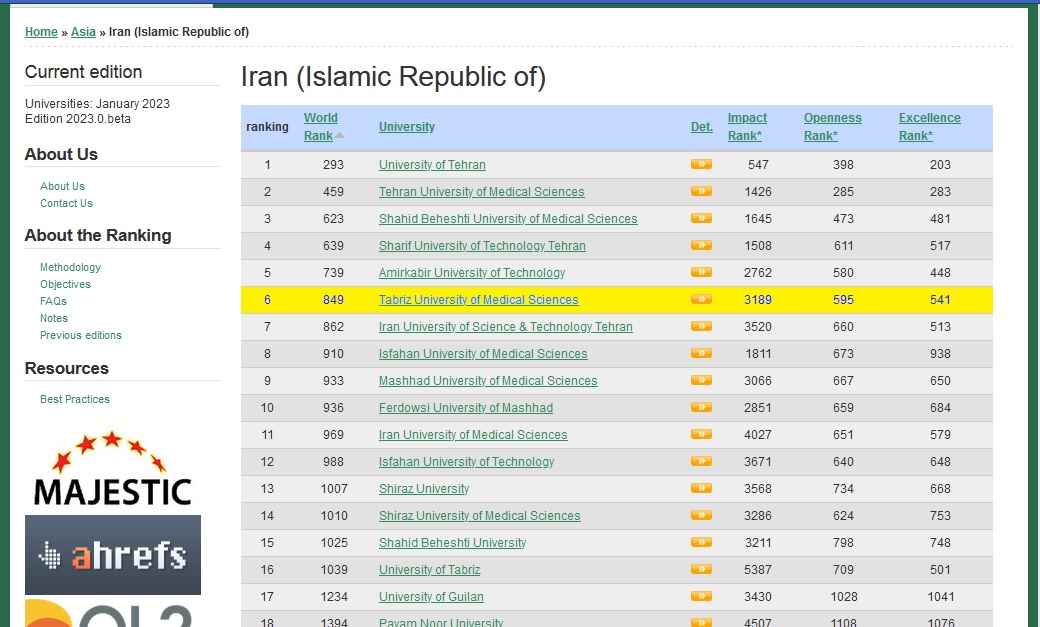 کسب رتبه سوم دانشگاه علوم پزشکی تبریز در رتبه بندی دانشگاههای علوم پزشکی کشور در نظام رتبهبندی جهانی Webometrics