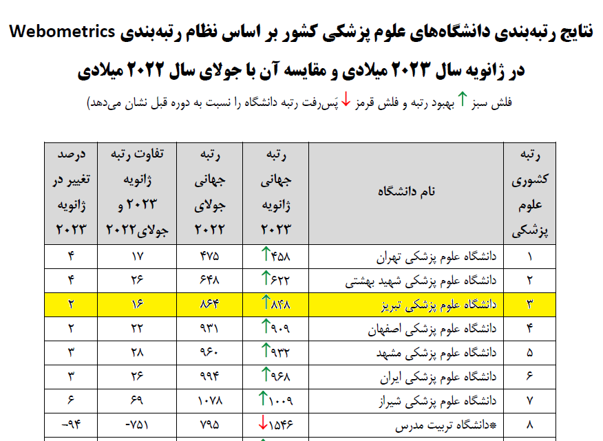 سه دانشگاه علوم پزشکی تهران، شهید بهشتی و تبریز رتبه های اول تا سوم کشوری را در رتبه بندی دانشگاههای علوم پزشکی کشور در نظام رتبهبندی جهانی Webometrics که در ژانویه سال 2023 منتشر شده است، کسب کردند.