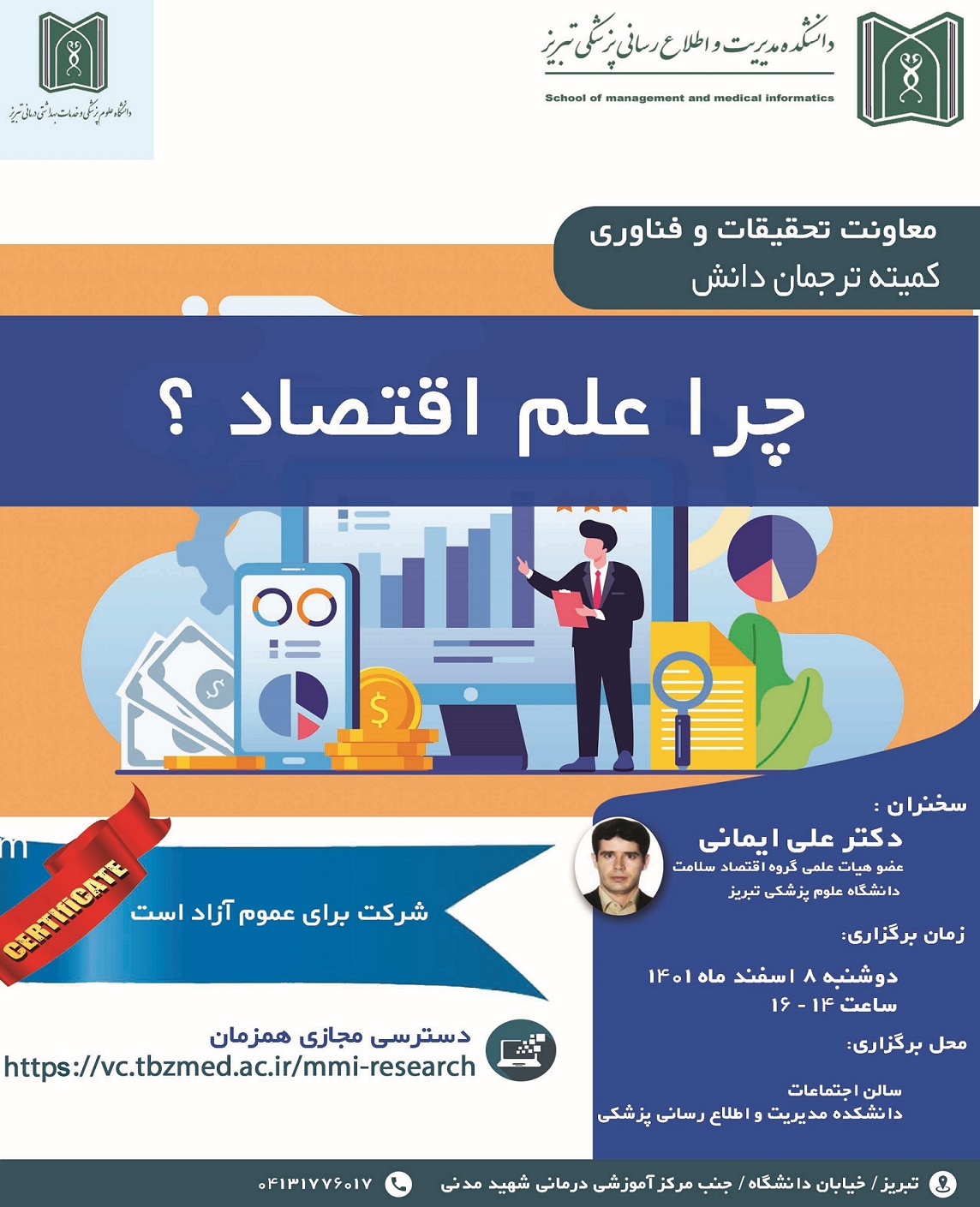 وبینار کمیته ترجمان دانش با موضوع "چرا علم اقتصاد؟" روز دوشنبه 8 اسفند ماه 1401 در سالن اجتماعات دانشکده مدیریت و اطلاع رسانی پزشکی به صورت حضوری و مجازی برگزار می شود