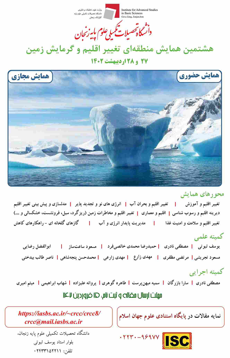 هشتمین همایش منطقه ای تغییر اقلیم و گرمایش زمین در روزهای ۲۷ و ۲۸ اردیبهشت ۱۴۰۲ توسط پژوهشکده تغییر اقلیم و گرمایش زمین وابسته به دانشگاه تحصیلات تکمیلی علوم پایه زنجان برگزار می شود: