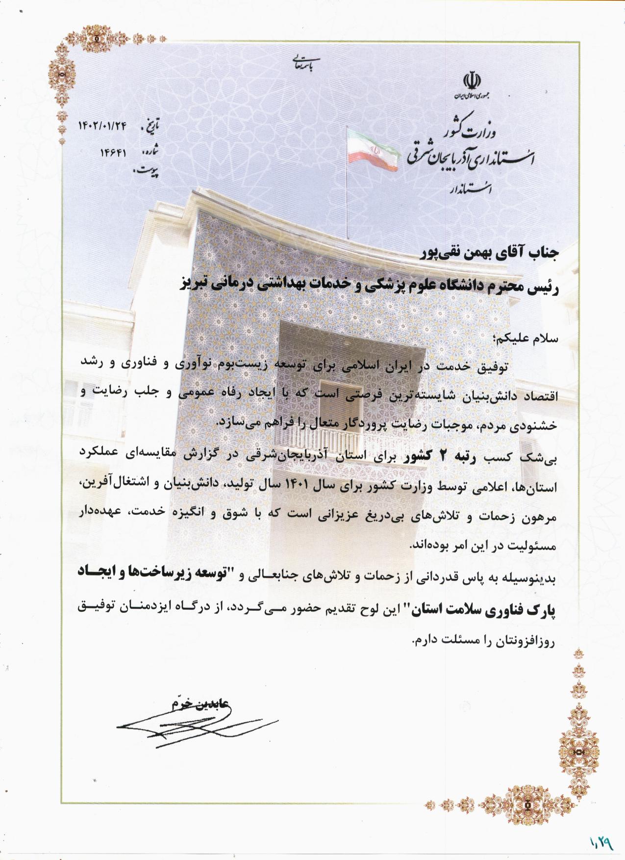 استاندار آذربایجانشرقی به پاس قدردانی از زحمات و تلاش های رئیس دانشگاه علوم پزشکی تبریز در توسعه زیرساخت ها و ایجاد پارک فناوری سلامت استان لوح تقدیر ارسال کرد