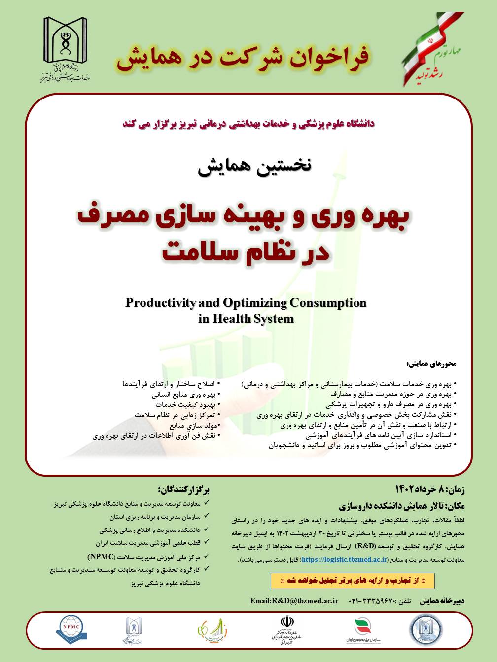 معاونت توسعه مدیریت و منابع دانشگاه علوم پزشکی تبریز نخستین همایش بهره وری و بهینه سازی مصرف در نظام سامت را 8 خرداد 1402 در تالار همایش دانشکده داروسازی برگزار می کند.