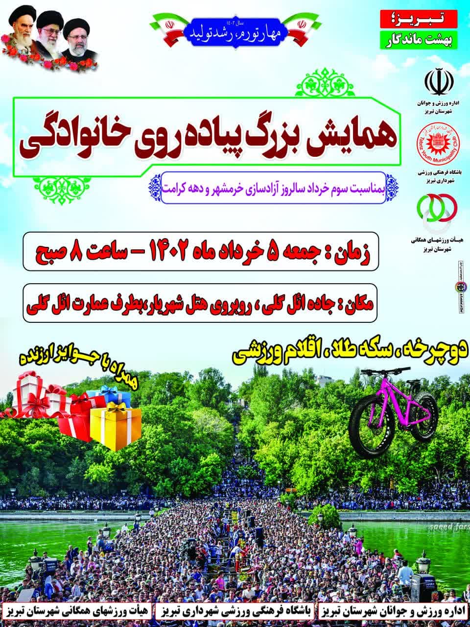 همایش بزرگ پیاده روی خانوادگی همراه با جوایز ارزنده با عنایت به مصوبه شورای عالی ورزش شهرستان تبریز به مناسبت گرامیداشت سوم خرداد سالروز آزادسازی خرمشهر و دهه کرامت روز جمعه 5 خرداد ماه برگزار می شود