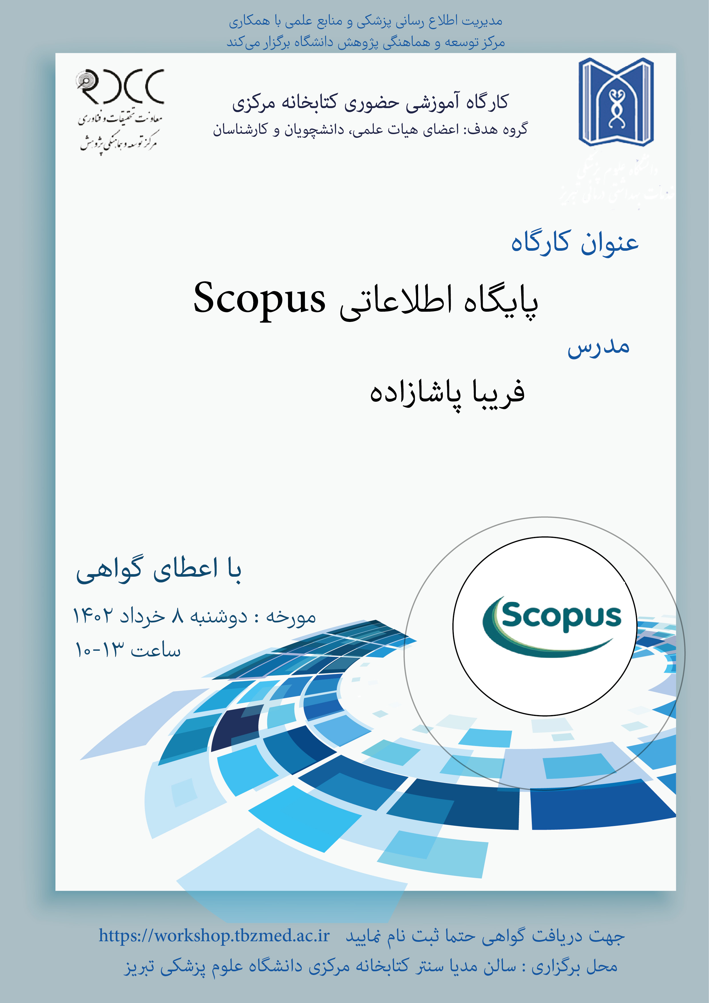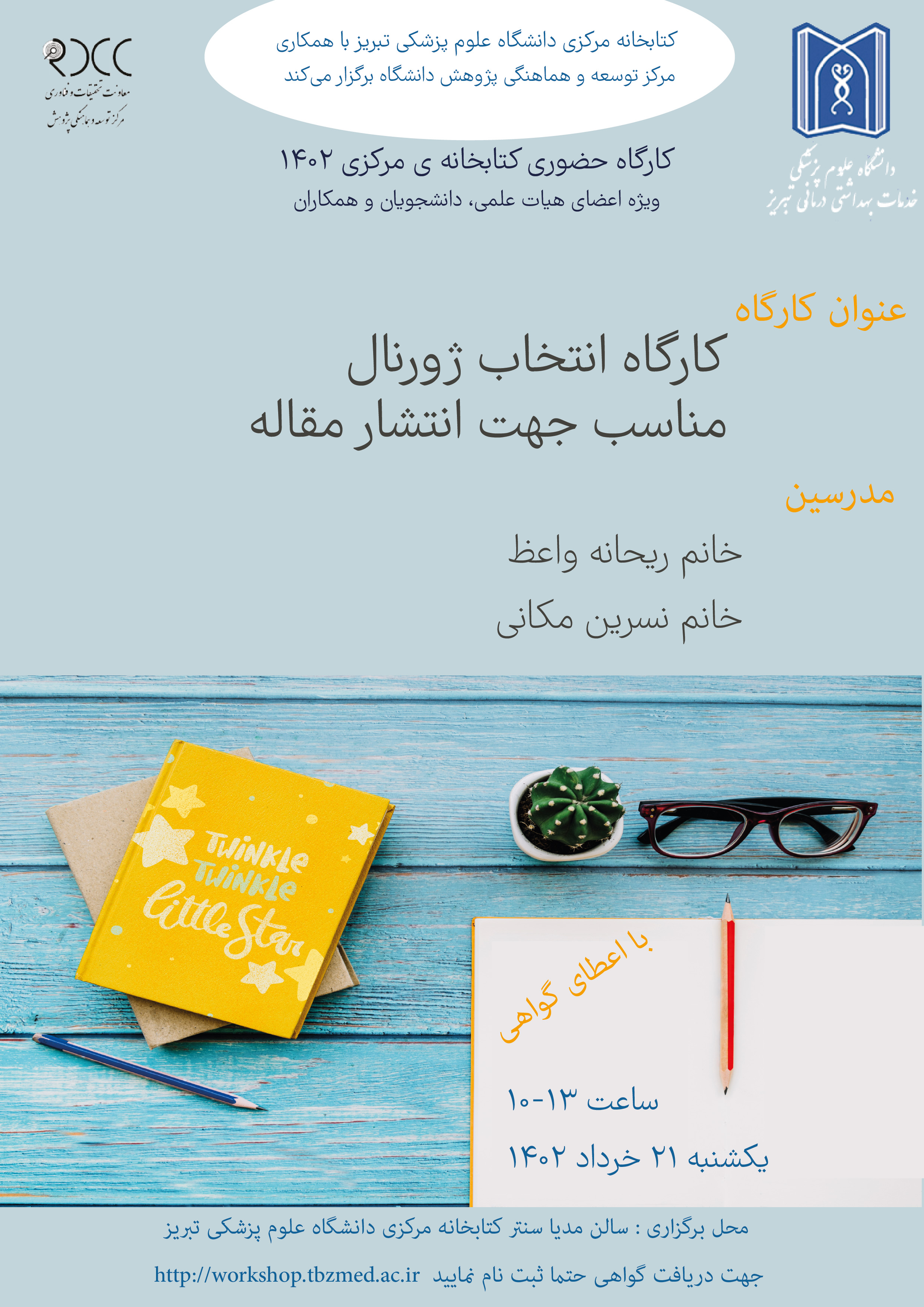 مدیریت اطلاع رسانی پزشکی و منابع علمی ( کتابخانه مرکزی ) دانشگاه علوم پزشکی تبریز با همکاری مرکز توسعه و هماهنگی پژوهش دانشگاه برگزار می کند: