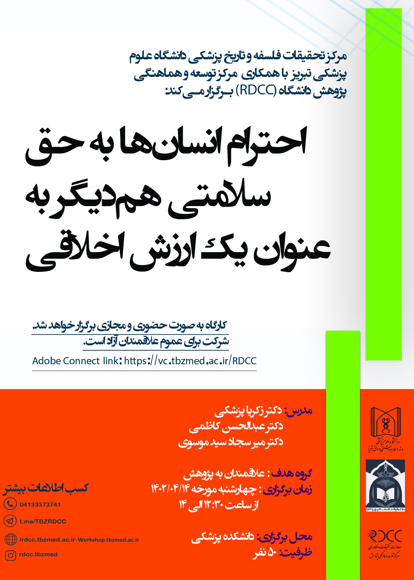 مرکز تحقیقات فلسفه و تاریخ پزشکی دانشگاه علوم پزشکی تبریز، کارگاه" احترام انسان ها به حق سلامتی هم دیگر به عنوان یک ارزش اخلاقی " را به صورت حضور و مجازی در 14 تیرماه 1402 برگزار می کند