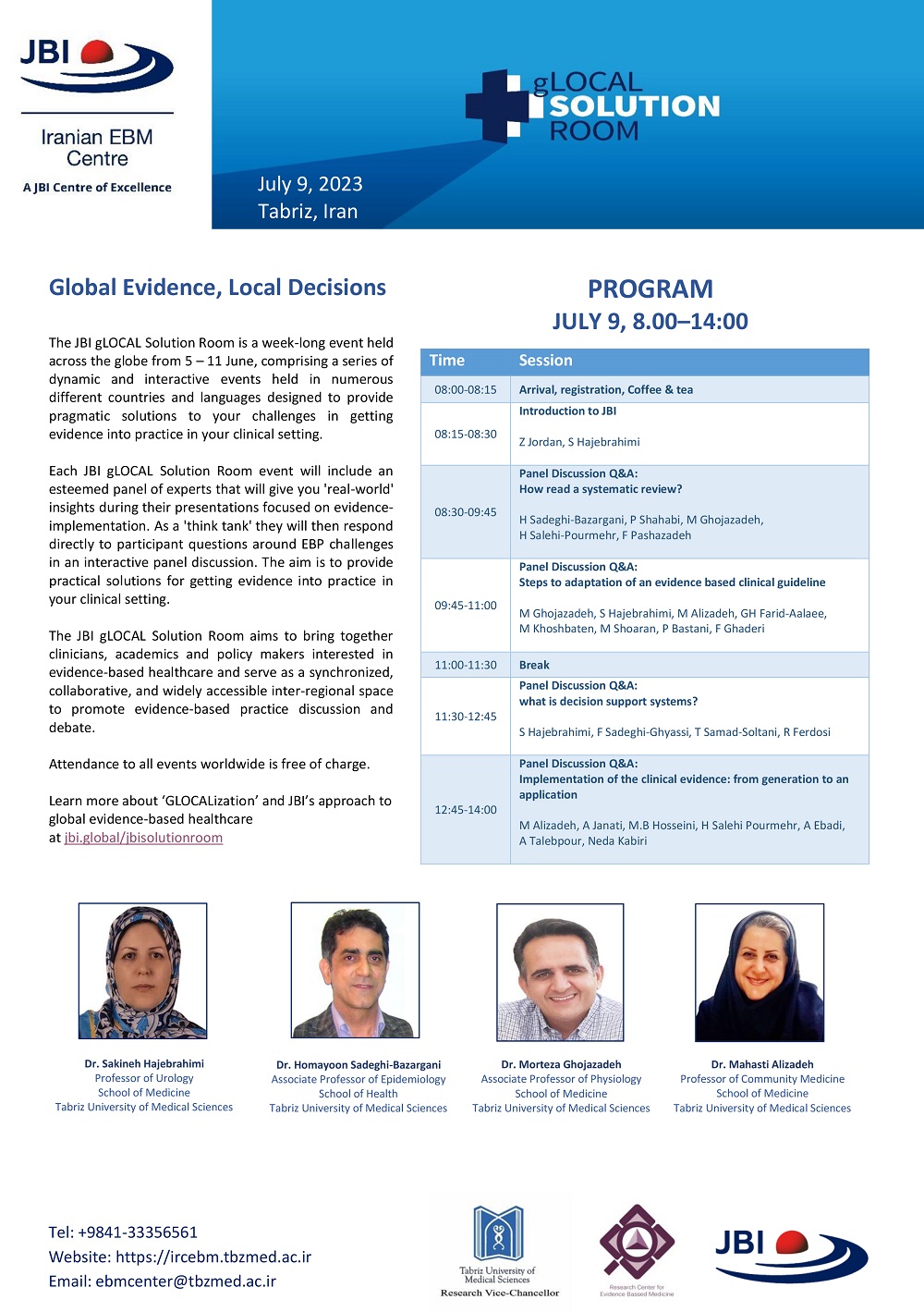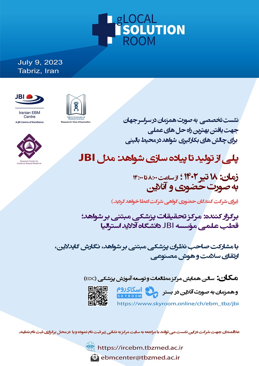 به گزارش روابط عمومی معاون تحقیقات و فناوری به نقل از مرکز تحقیقات EBM به عنوان قطب علمی موسسه JBI استرالیا و رییس JBI منطقه اروپا در سال 2023، این مرکز نشستی تخصصی در قالب برنامه سالانه JBI gLocal Solution Room تحت عنوان "چالش های بکارگیری شواهد درمحیط بالینی" را روز یکشنبه 18 تیر ماه 1402 از ساعت 8 الی 14 به صورت حضوری در سالن همایش مرکز مطالعات و توسعه آموزش پزشکی (EDC) و همزمان به صورت برخط برگزار می کند.