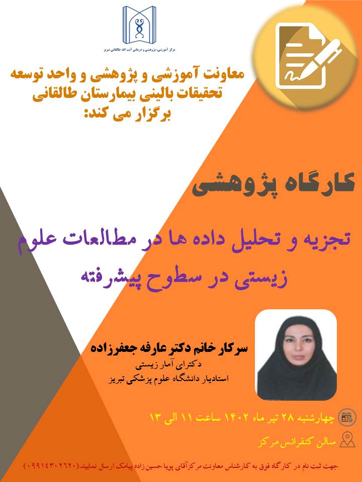 واحد توسعه تحقیقات بالینی مرکز آموزشی و پژوهشی بیمارستان طالقانی ، کارگاه پژوهشی تحت عنوان "تجزیه و تحلیل داده ها در مطالعات علوم زیستی در سطوح مقدماتی" را 28 تیرماه 1402 برگزار می کند
