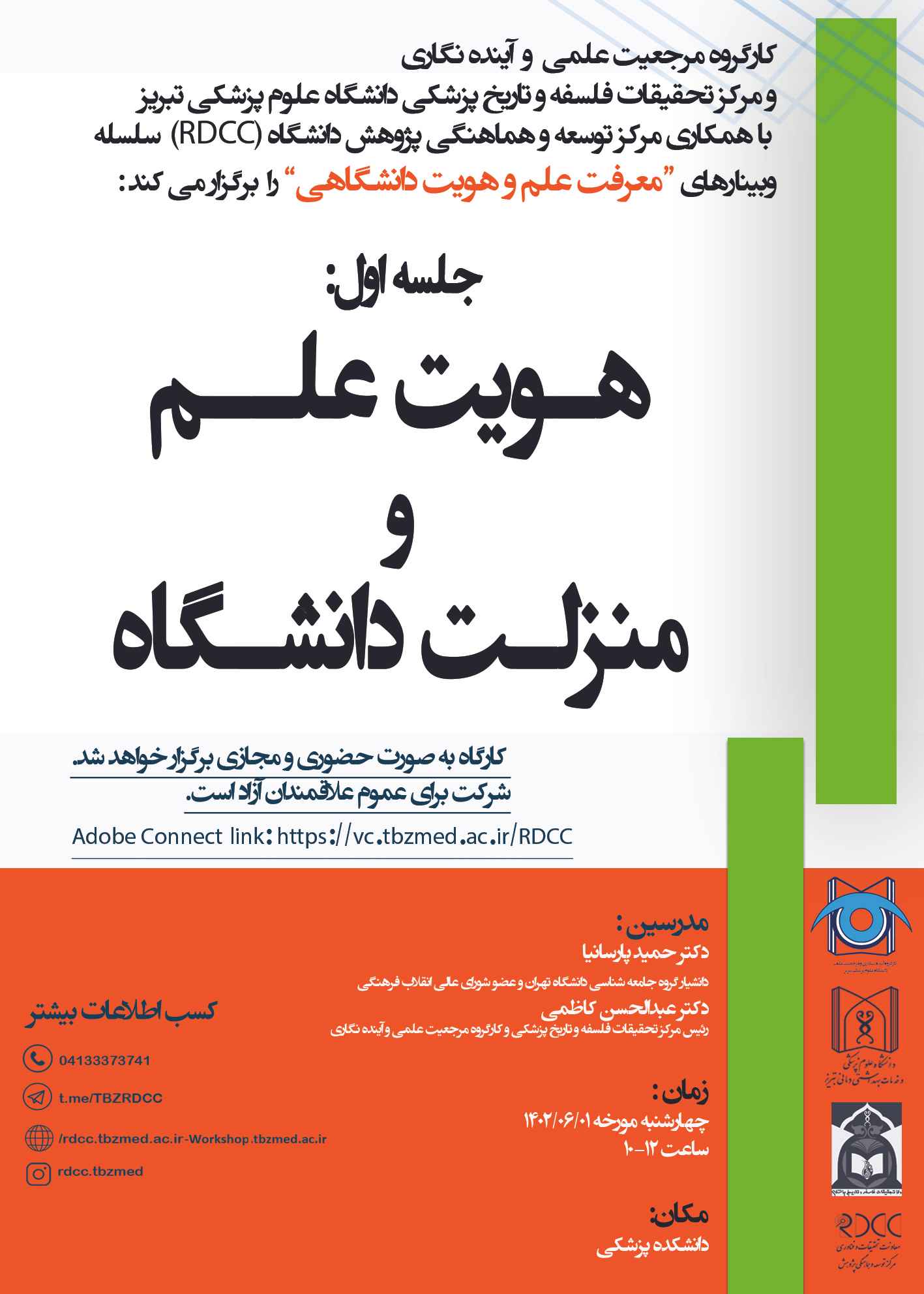 مرکز تحقیقات فلسفه و تاریخ پزشکی دانشگاه علوم پزشکی تبریز، سلسله وبینار های: (معرفت علم و هویت دانشگاهی) را به صورت حضوری و مجازی در 1 شهریور ماه 1402 برگزار می کند