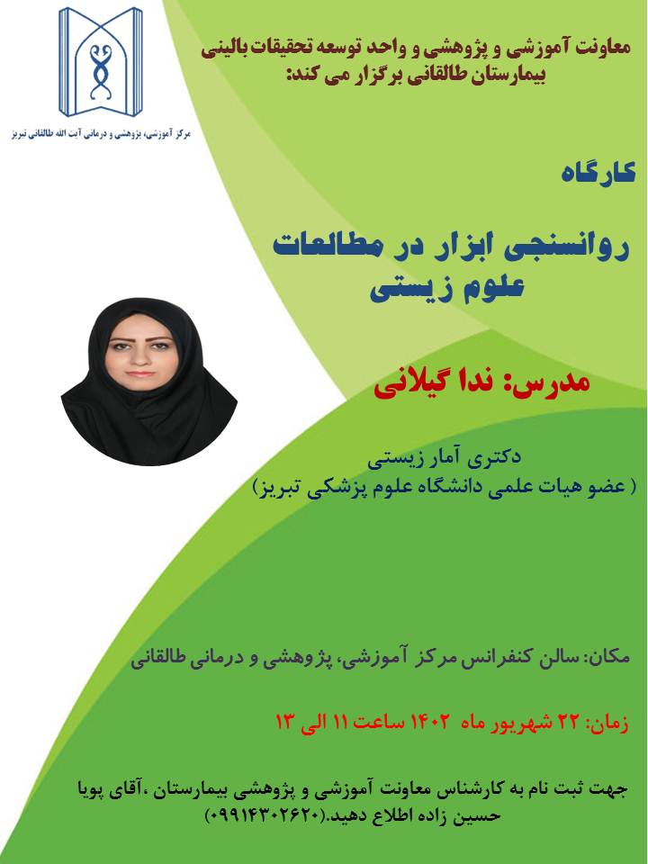 واحد توسعه تحقیقات بالینی مرکز آموزشی و پژوهشی بیمارستان طالقانی ، کارگاه پژوهشی تحت عنوان "روانسنجی ابزار در مطالعات علوم زیستی" را 22 شهریورماه 1402 برگزار می کند