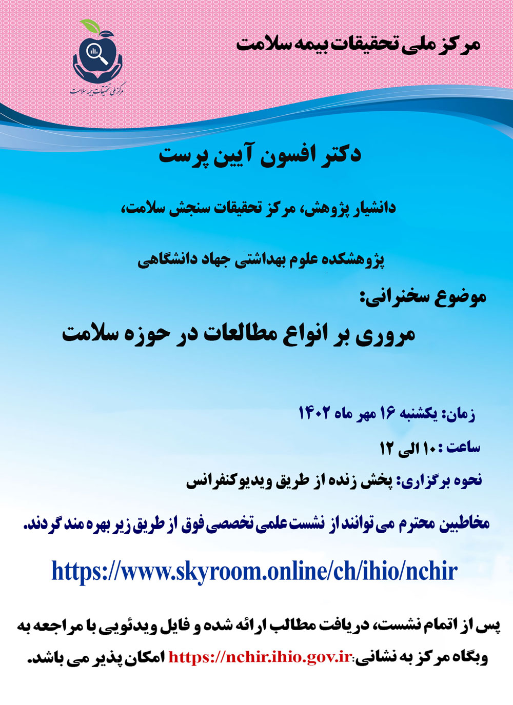 مرکز ملی تحقیقات بیمه سلامت نشست علمی تخصصی با عنوان "مروری بر انواع مطالعات درحوزه سلامت حوزه سلامت" برگزار می نماید.