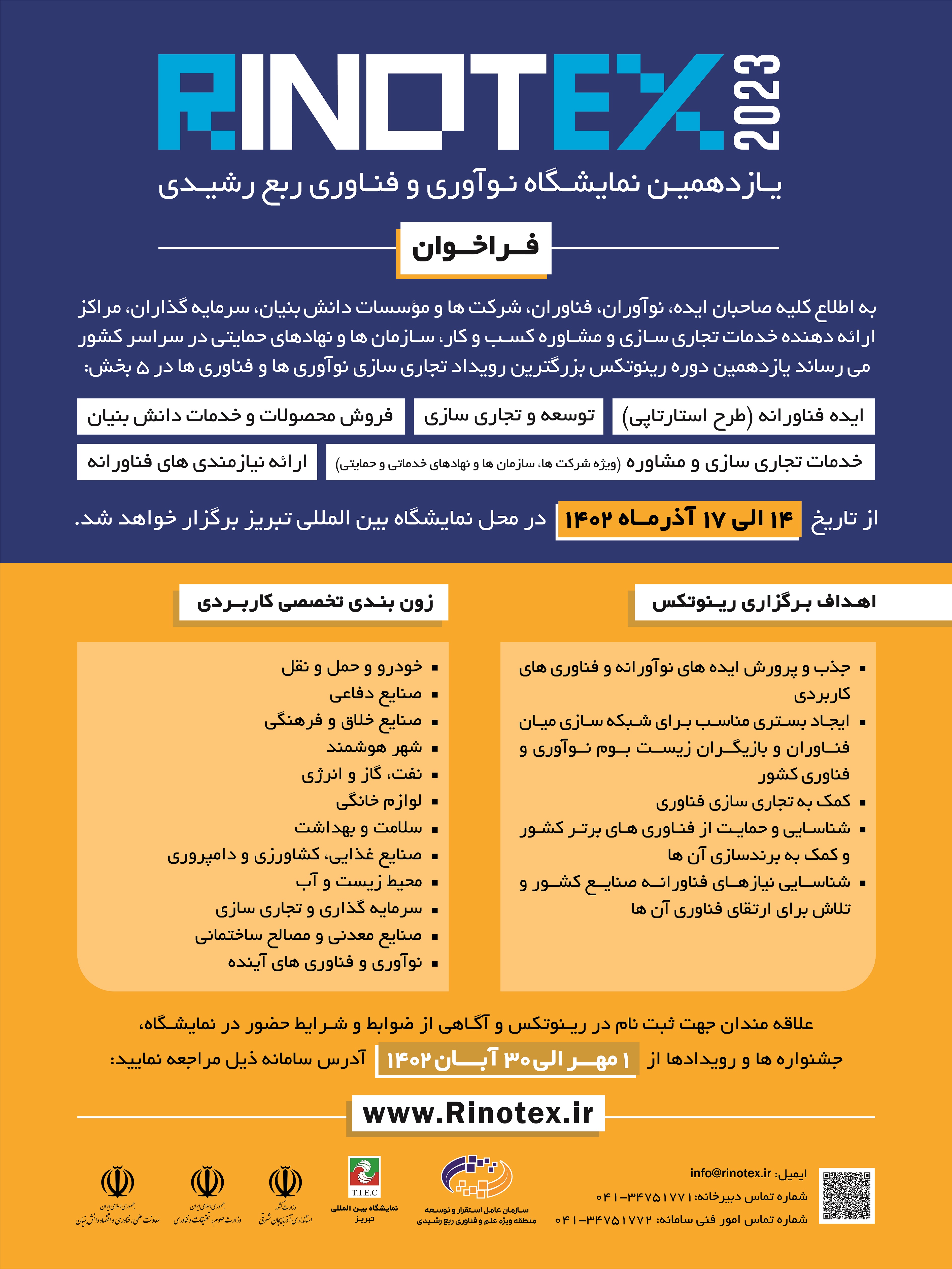 روابط عمومی معاونت تحقیقات و فناوری به نقل از ستاد اجرایی یازدهمین نمایشگاه نوآوری و فناوری ربع رشیدی، به اطلاع کلیه صاحبان ایده، نوآوران و فناوران میرساند یازدهمین دوره رینوتکس، بزرگترین رویداد تجاریسازی نوآوریها و فناوریها از تاریخ 14 الی 17 آذرماه ۱۴۰۲ در محل نمایشگاه بینالمللی تبریز برگزار خواهد شد.