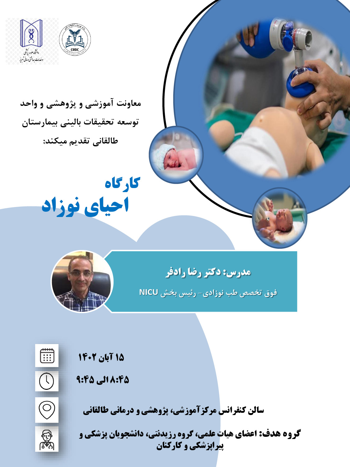 واحد توسعه تحقیقات بالینی مرکز آموزشی و پژوهشی بیمارستان طالقانی ، کارگاه علمی تحت عنوان " احیای نوزاد" را روز دوشنبه 15آبان ماه 1402 برگزار می کند