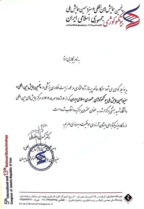 افتخار آفرینی خانم پریناز نژاد مختاری در پنجمین همایش بین المللی و سیزدهمین همایش ملی بیوتکنولوژی جمهوری اسلامی ایران