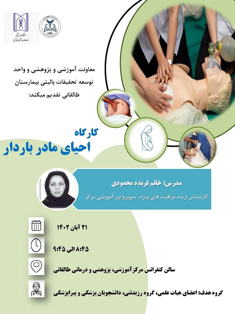 واحد توسعه تحقیقات بالینی مرکز آموزشی و پژوهشی بیمارستان طالقانی ، کارگاه علمی تحت عنوان " احیای مادر باردار " را روز یکشنبه 21 آبان ماه 1402 در سالن کنفرانس مرکز برگزار می کند