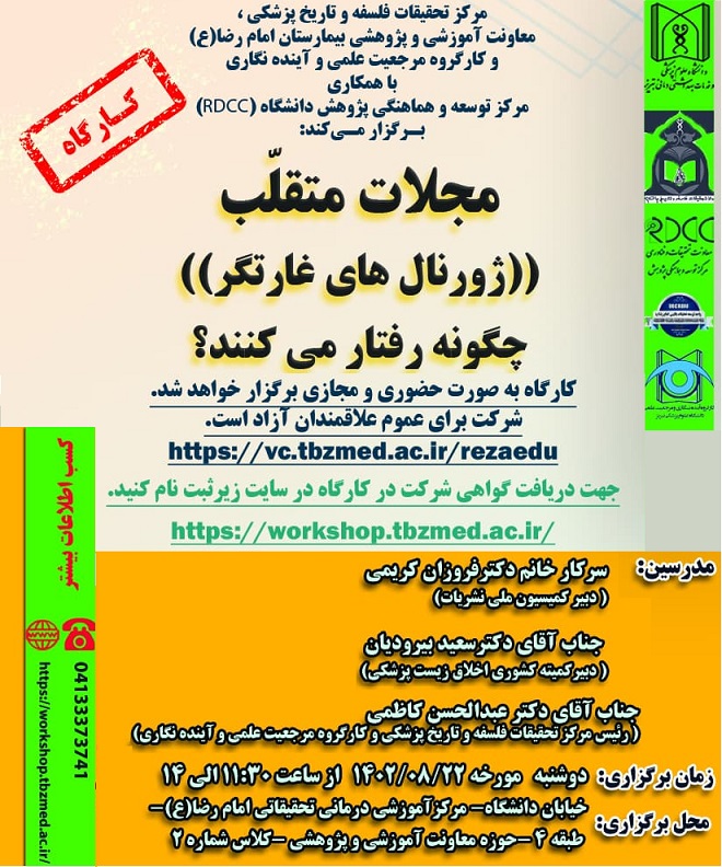 مرکز تحقیقات فلسفه و تاریخ پزشکی دانشگاه علوم پزشکی تبریز، معاونت آموزشی و پژوهشی بیمارستان امام رضا(ع) و کارگروه مرجعیت علمی و آینده نگاری با همکاری مرکز توسعه و هماهنگی پژوهش دانشگاه (RDCC) کارگاه مجلات متقلّب " ژورنال های غارتگر" چگونه رفتار می کنند؟ را روز دوشنبه 22 آبانماه 1402 برگزار می کند.