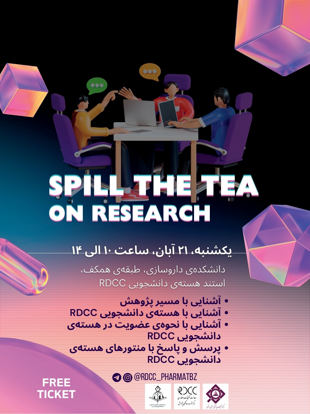 مرکز توسعه و هماهنگی پژوهش دانشگاه (RDCC) با همکاری دانشکده داروسازی و کمیته تحقیقات دانشجویی نشست " SPILL THE TEA ON RESEARCH " را روز یکشنبه 21 آبانماه 1402 از ساعت 10 الی 14 در طیقه همکف دانشکده محل استند هسته ی دانشجویی برگزار می کند
