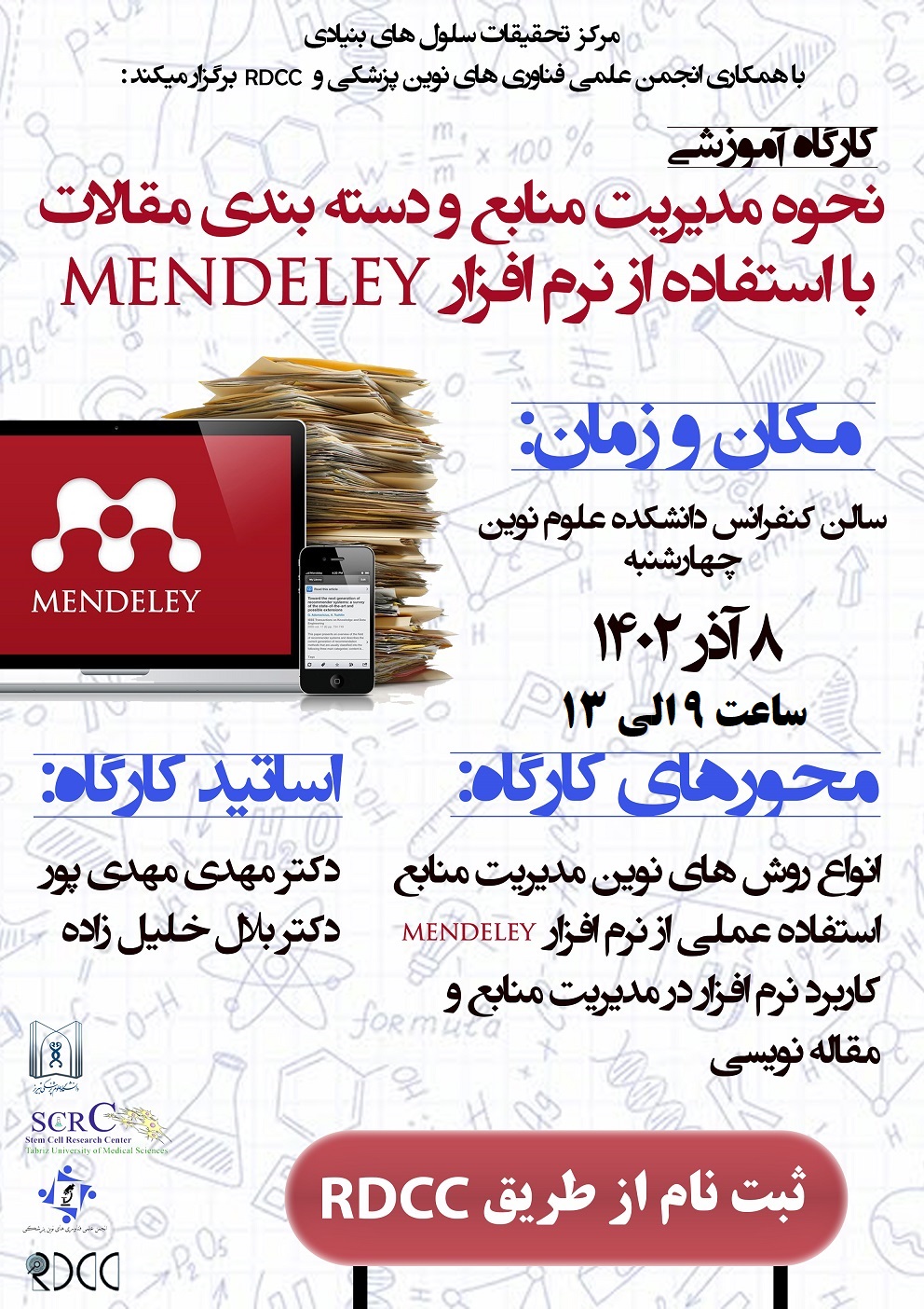 مرکز تحقیقات سلولهای بنیادی با همکاری انجمن علمی فناوری های نوین پزشکی و مرکز توسعه و هماهنگی پژوهش (RDCC)، کارگاه آموزشی تحت عنوان " مدیریت منابع و دسته بندی مقالات با استفاده از نرم افزار مندلی" را روز چهارشنبه 8 آذرماه 1402 برگزار می کند