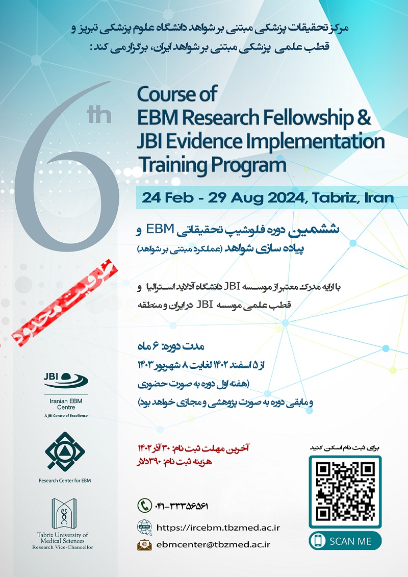 مرکز تحقیقات پزشکی مبتنی بر شواهد دانشگاه علوم پزشکی تبریز، قطب علمی موسسه JBI دانشگاه آدلاید استرالیا ششمین دوره فلوشیپ تحقیقاتی EBM و پیاده سازی شواهد (عملکرد مبتنی بر شواهد) را به مدت 6 ماه از ( اسفند 1402 تا شهریور 1403) برگزار می کند: