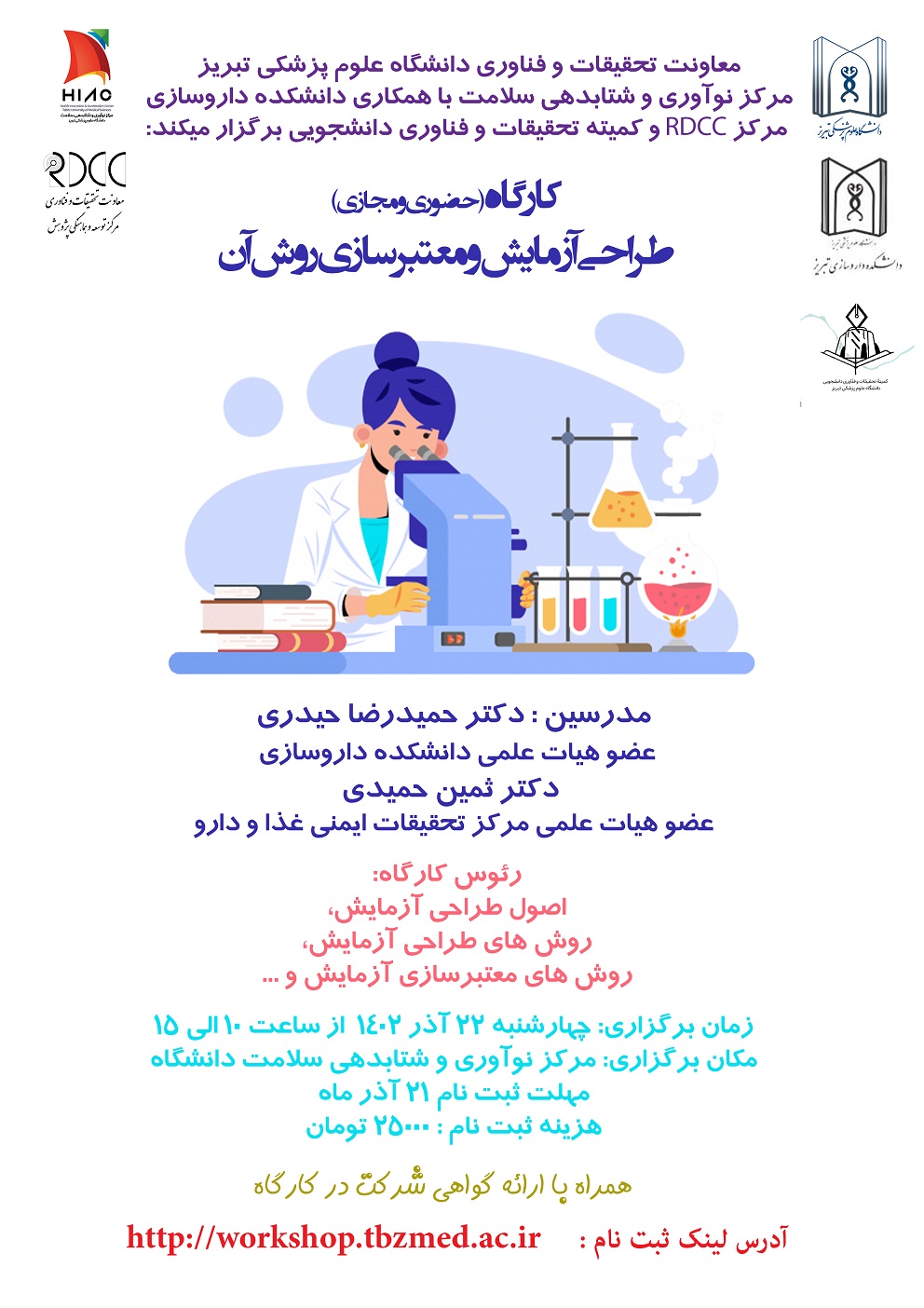مرکز نوآوری و شتابدهی سلامت با همکاری دانشکده داروسازی، مرکز RDCC و کمیته تحقیقات دانشجویی کارگاه حضوری و مجازی " طراحی آزمایش و معتبرسازی روش آن " را روز چهارشنبه 22 آذرماه 1402 برگزار می کند