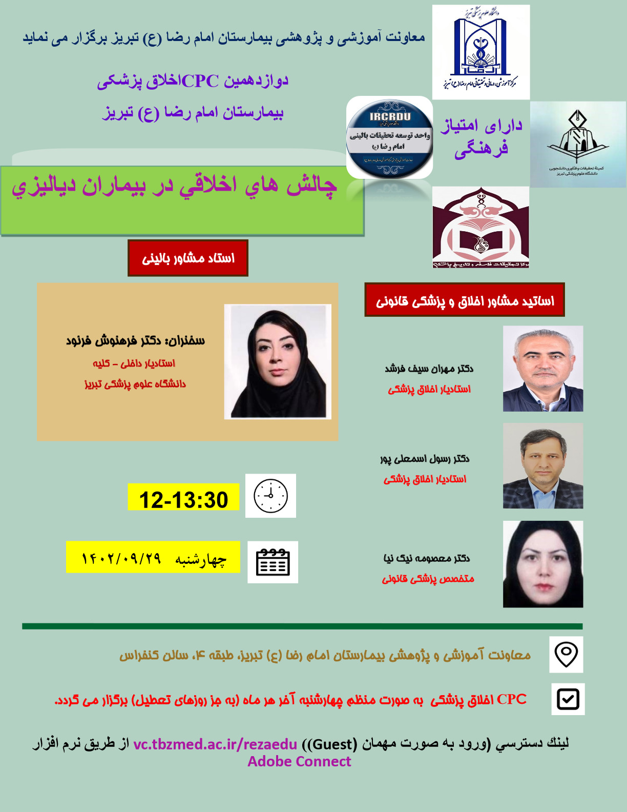واحد توسعه تحقیقات بالینی معاونت آموزشی و پژوهشی بیمارستان امام رضا (ع)، دوازدهمین CPC اخلاق پزشکی (چالش های اخلاقی در بیماران دیالیزی) را روز چهارشنبه 29 آذرماه 1402 در سالن کنفرانس مرکز برگزار می کند