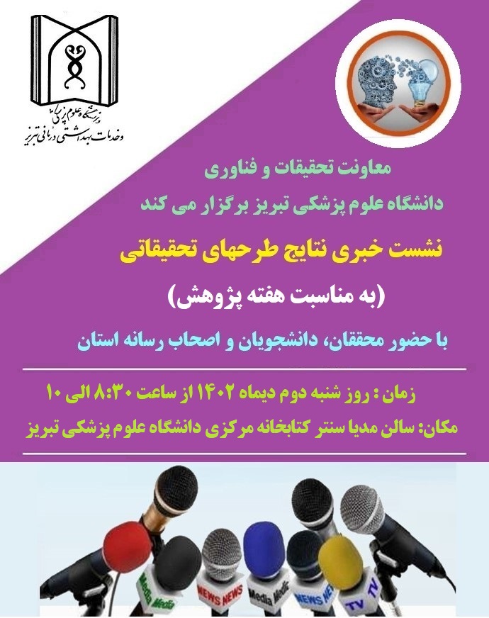 در راستای کاربردی کردن نتایج پژوهشهای سلامت، معاونت تحقیقات و فناوری دانشگاه علوم پزشکی تبریز، روز شنبه دوم دی ماه 1402 ، نشست خبری نتایج طرحهای تحقیقاتی را با حضور محققان، دانشجویان و اصحاب رسانه در سالن مدیا سنتر کتابخانه مرکزی برگزار می کند