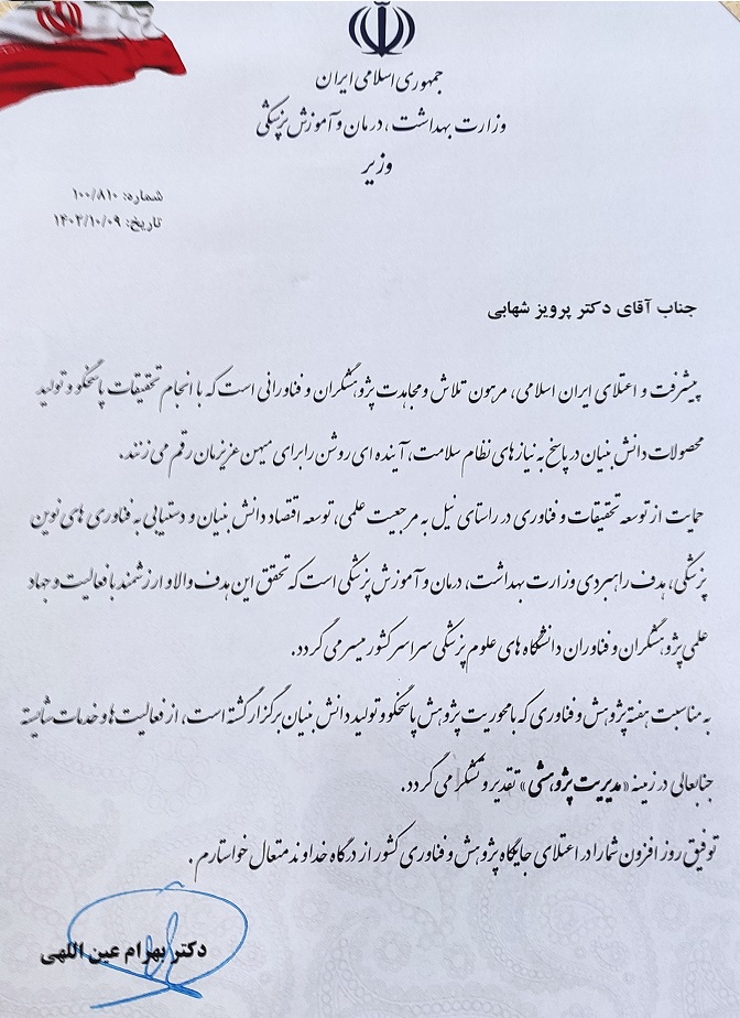در آئین تقدیراز پژوهشگران برتر حوزه پژوهش کشور با حضور دکتربهرام عین الهی وزیر بهداشت،درمان و آموزش پزشکی و حجت الاسلام و المسلمین عبدالحسین خسروپناه، دبیر شورای عالی انقلاب فرهنگی، از دکتر پرویز شهابی در زمینه مدیریت پژوهشی تقدیر شد.