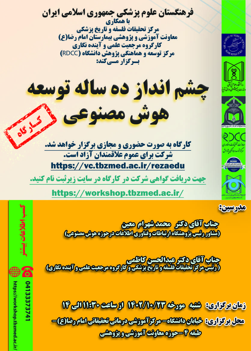 فرهنگستان علوم پزشکی جمهوری اسلامی ایران با همکاری کارگروه مرجعیت علمی و آینده نگاری دانشگاه علوم پزشکی تبریز، مرکز تحقیقات فلسفه و تاریخ پزشکی، معاونت آموزشی و پژوهشی بیمارستان امام رضا(ع) و مرکز توسعه و هماهنگی پژوهش دانشگاه (RDCC) کارگاه (چشم انداز ده ساله توسعه هوش مصنوعی) را روز شنبه 23 دیماه 1402 برگزار می کند.