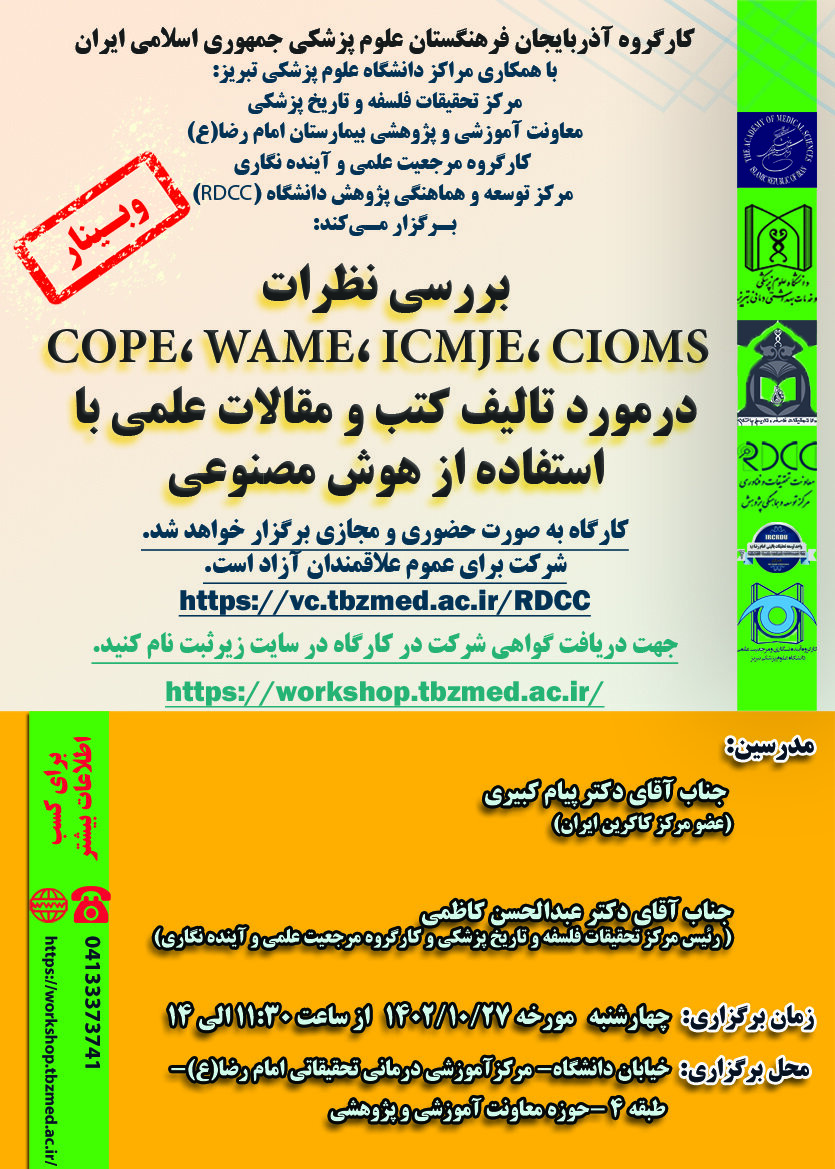 کارگروه آذربایجان فرهنگستان علوم پزشکی جمهوری اسلامی ایران با همکاری مرکز تحقیقات فلسفه و تاریخ پزشکی دانشگاه (RDCC) کارگاه (بررسی نظرات COPE, WAME, ICMJE, CIOMS در مورد تالیف کتب و مقالات با استفاده از هوش مصنوعی ) را روز چهارشنبه 27دیماه 1402 برگزار می کند.