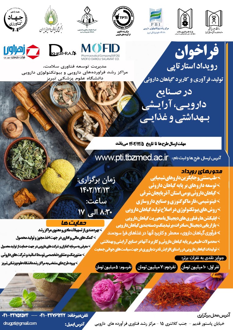 همچنین به منظور آشنایی فناوران حوزه گیاهان داروئی با گیاهان دارویی و بومی استان آذربایجان شرقی ،روش ها و فرآیندهای جداسازی و شناسایی مواد موثرگیاهان دارویی، نحوه کنترل کیفی محصولات بر پایه گیاهان دارویی ، طبیعی و سنتی و همچنین نحوه اخذ مجوز گیاهان دارویی ،داروهای طبیعی و مکمل ، پنل تخصصی در حاشیه این رویداد برگزار خواهد شد.
